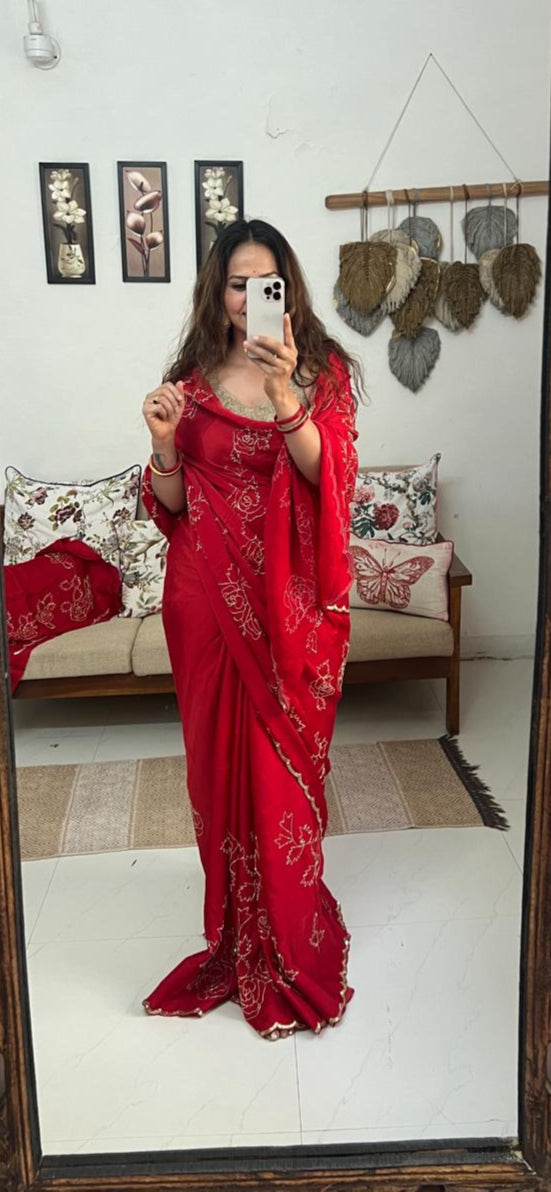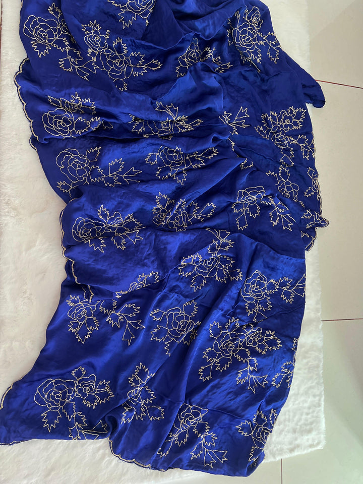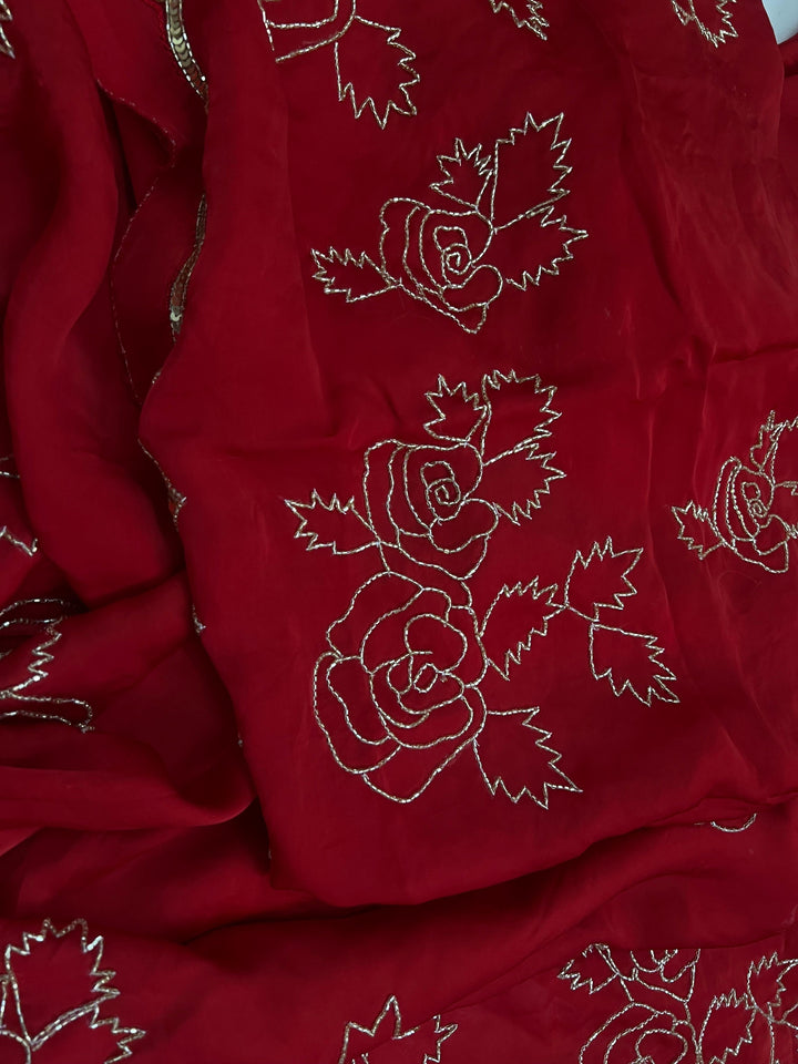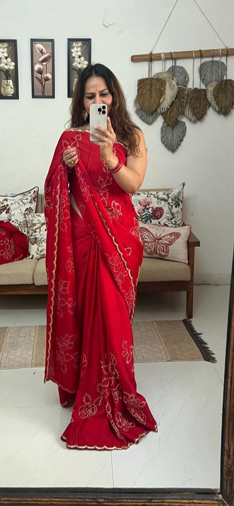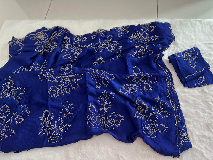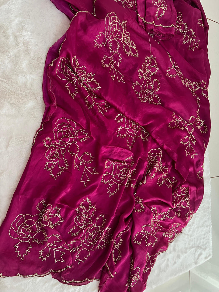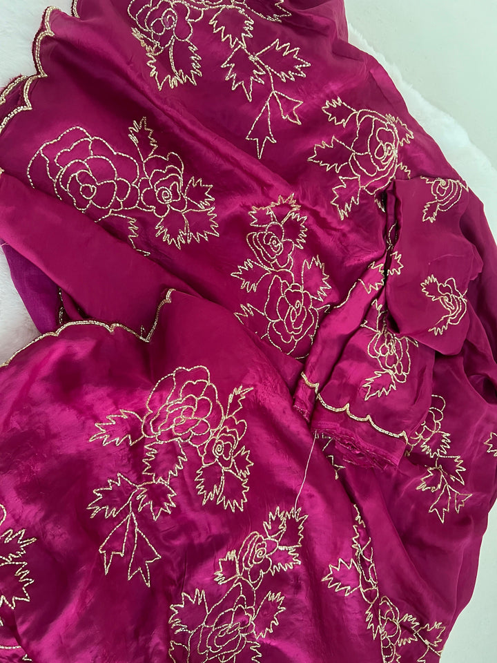 A graceful satin-organza drape featuring delicate hand-embroidered gulab motifs—timeless, festive, and elegant in every shade.