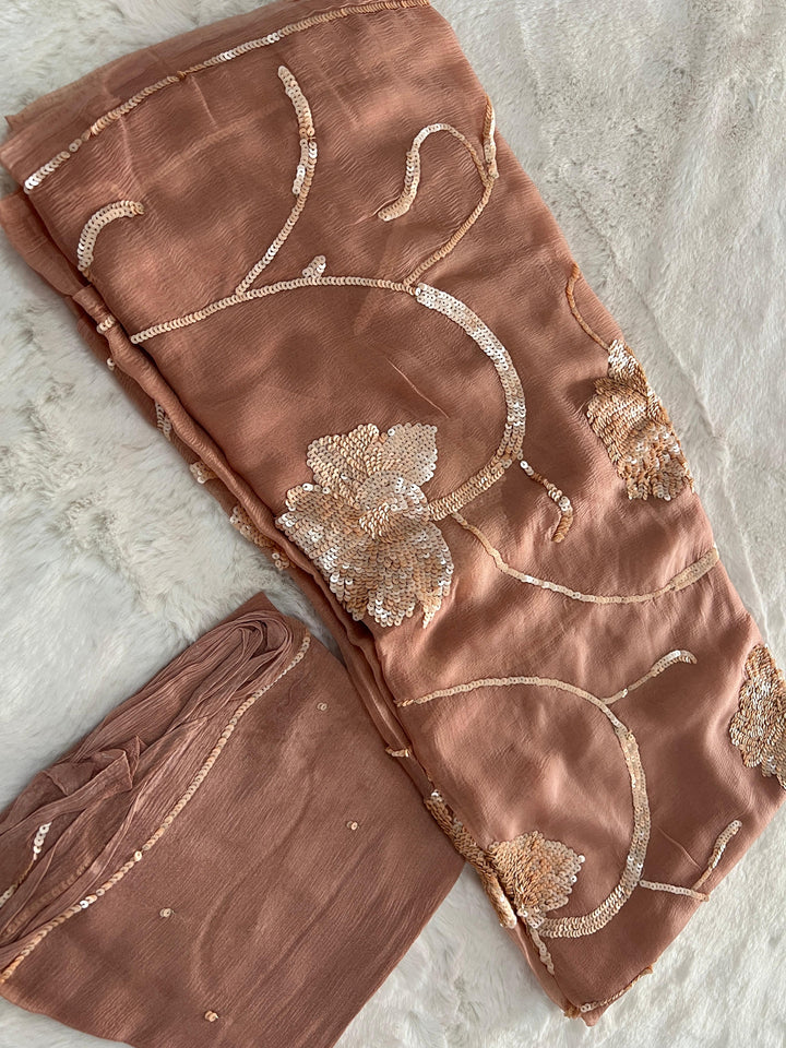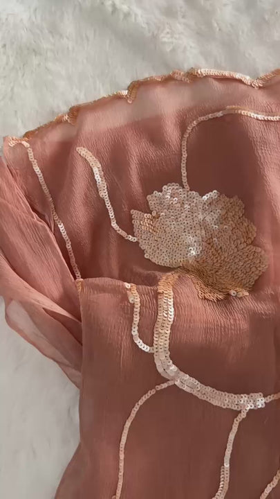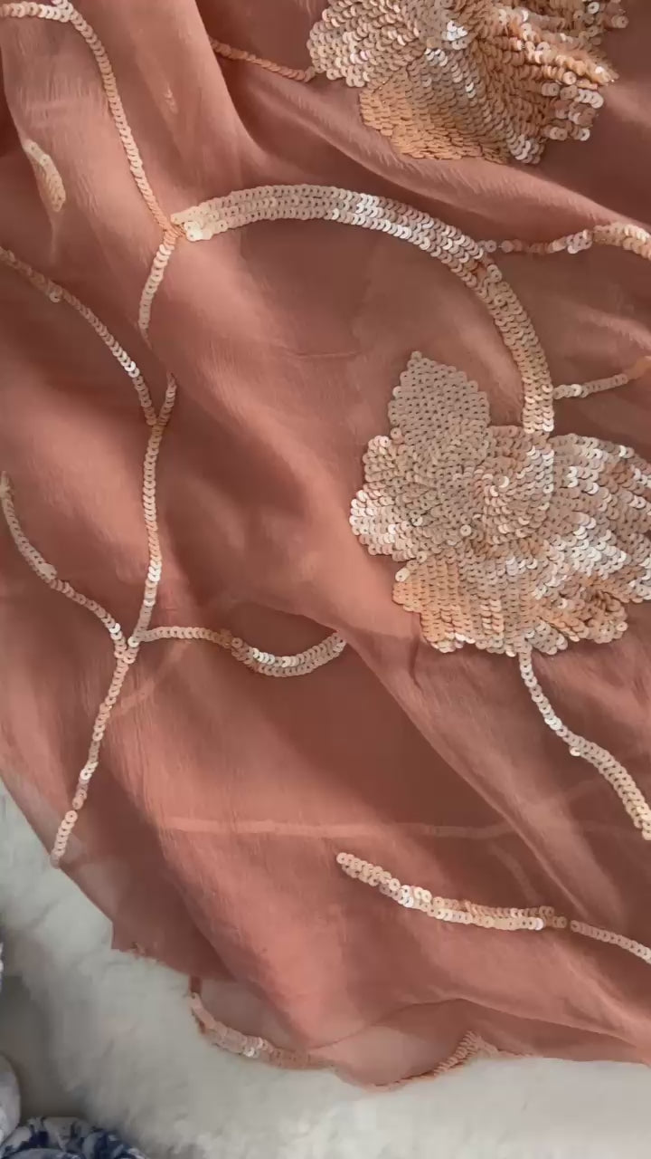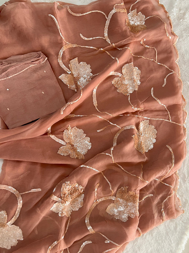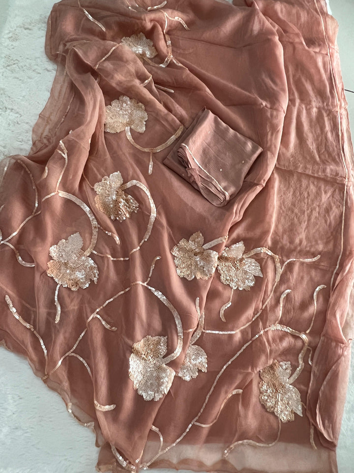 Crafted from luxurious diamond chiffon, the saree features a delicate floral border handwork jaal that gracefully flows along the palla and skirt. The coordinated crepe blouse with subtle embroidery on the sleeves completes the ensemble, making it perfect for engagement parties, receptions, or romantic evening soirees 🌷🌙