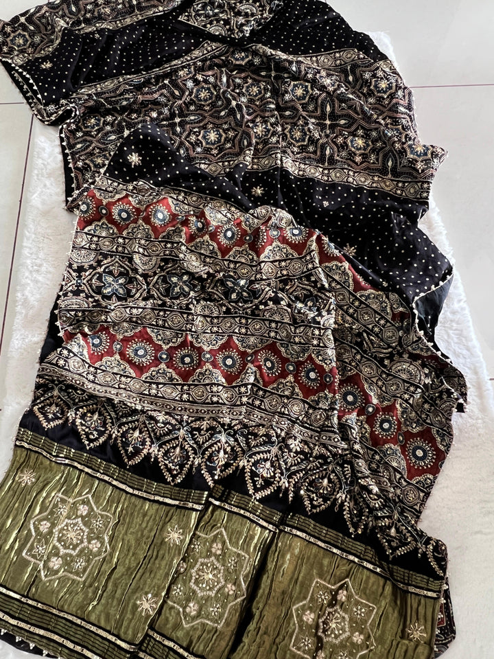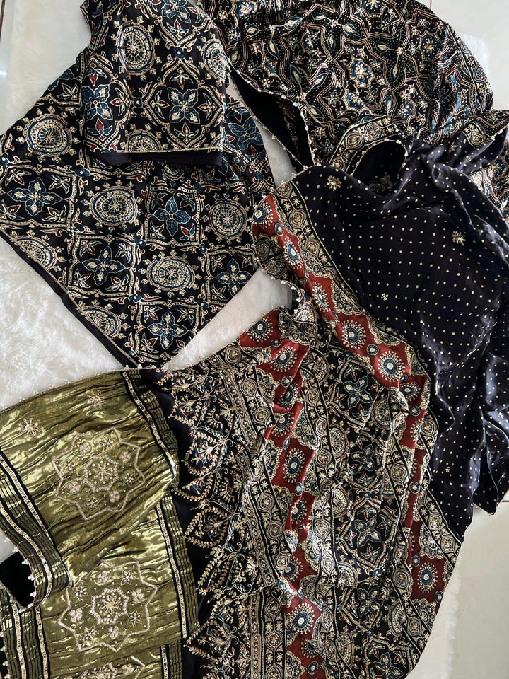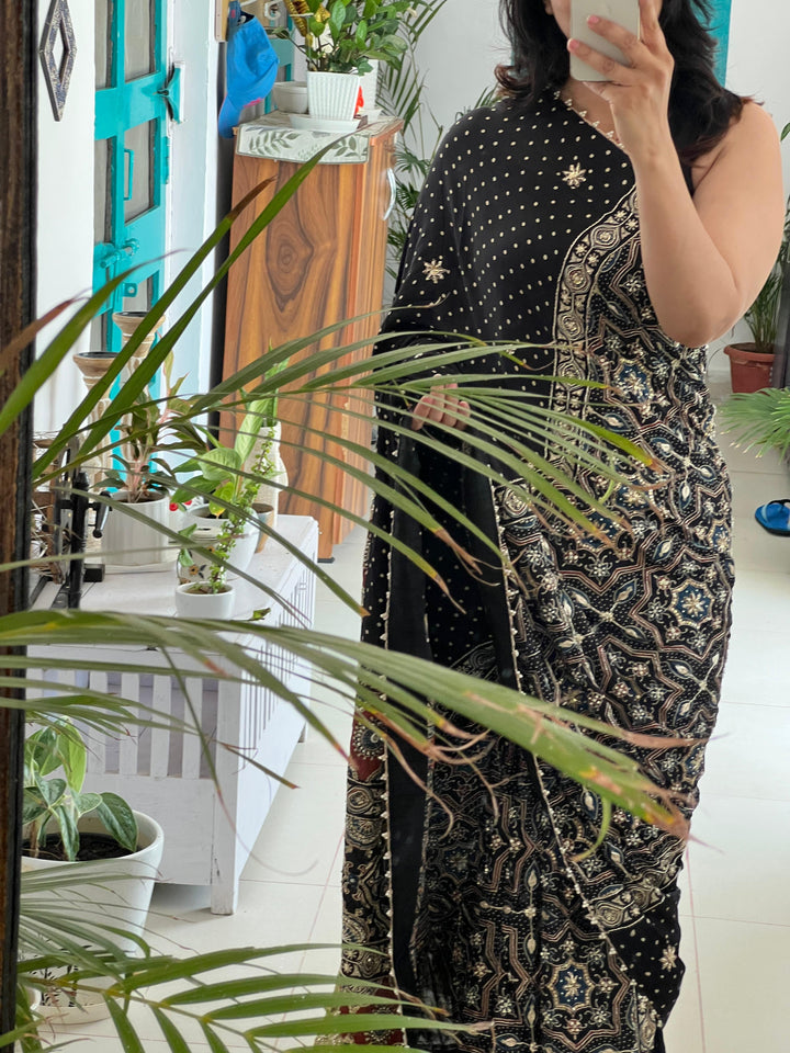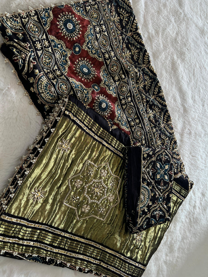 An ode to earthy traditions and regal handwork—this masterpiece blends ancient Ajrakh artistry with timeless zardozi finesse.