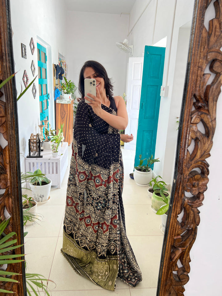 🎨 Craft: Hand-dyed & hand block printed Ajrakh – each saree takes 10–20 days to complete
