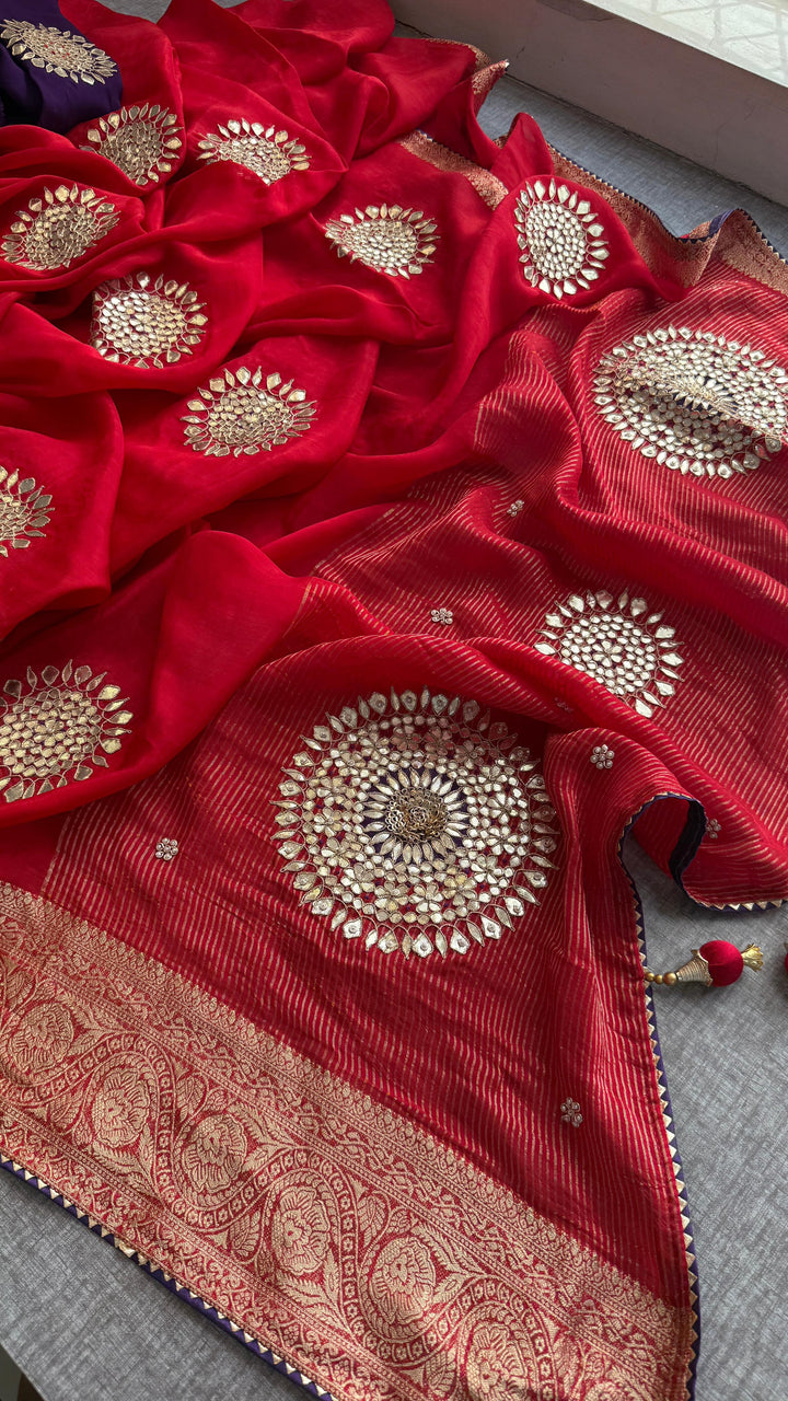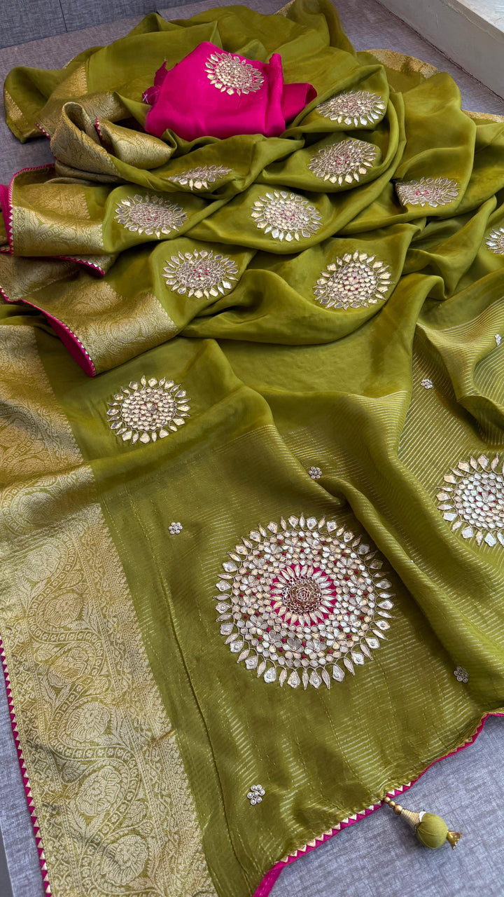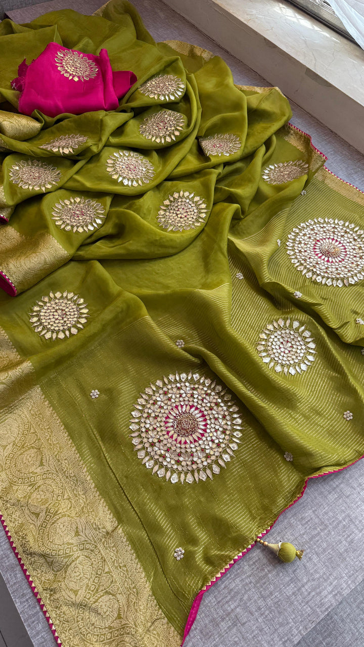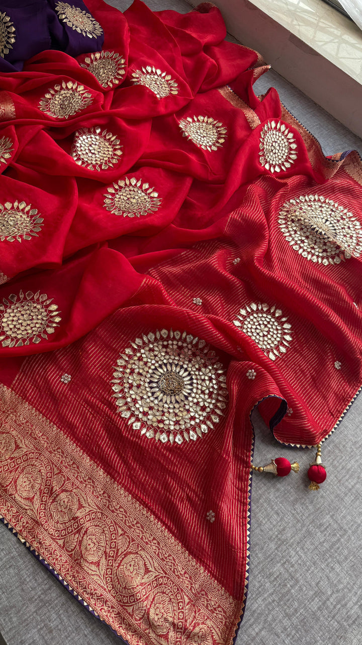 🪡 Handwork: Delicately embellished with Gotapatti, Zardozi, Anchor threadwork & Pearl detailing