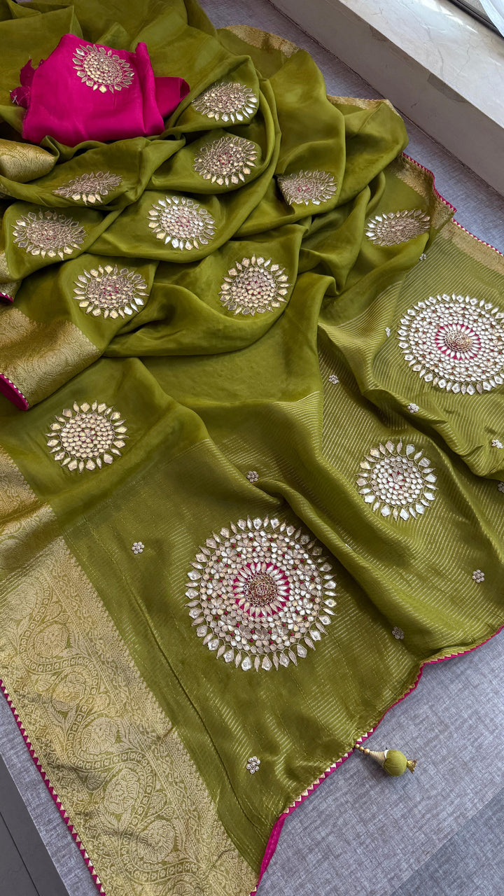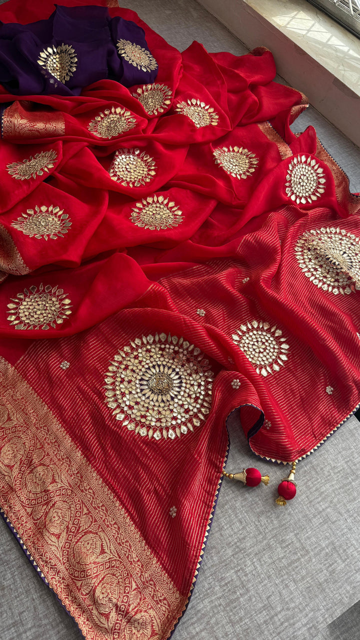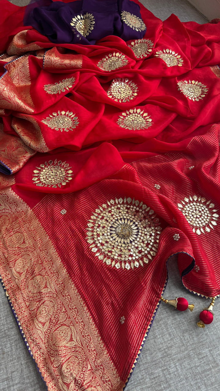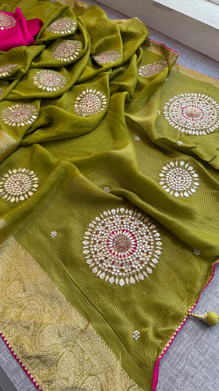🪡 Handwork: Delicately embellished with Gotapatti, Zardozi, Anchor threadwork & Pearl detailing
