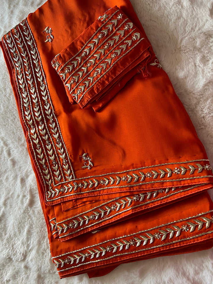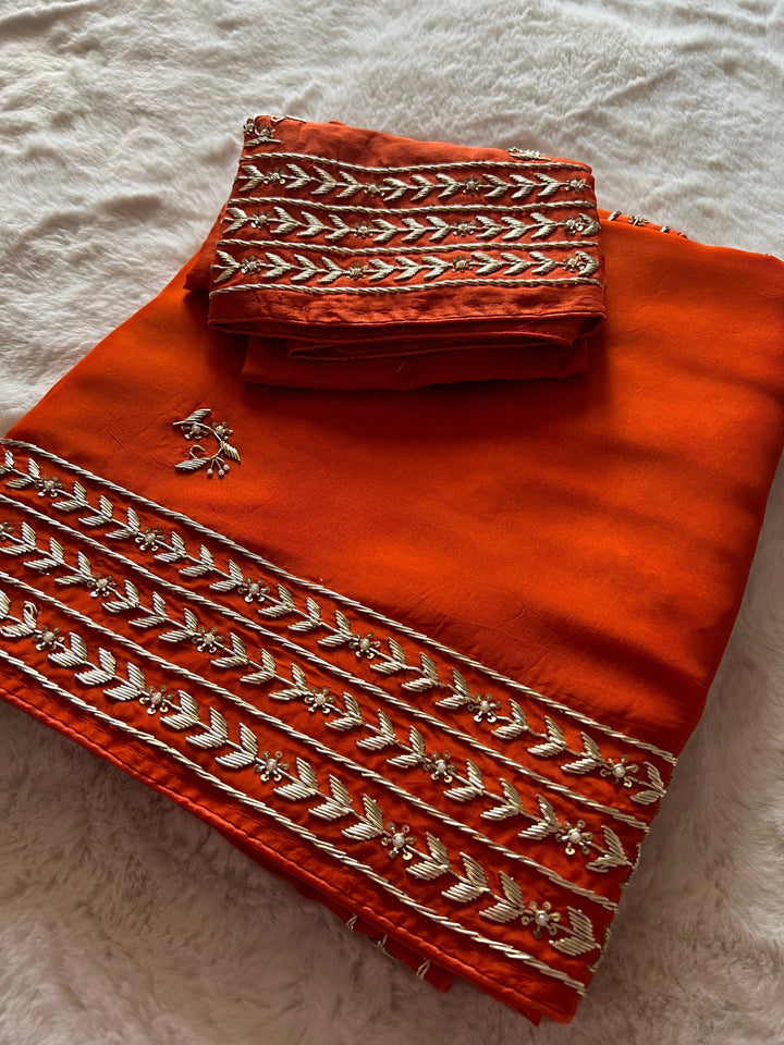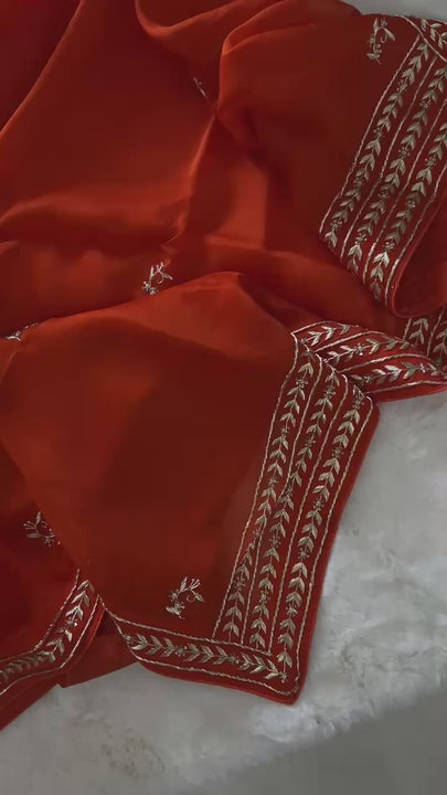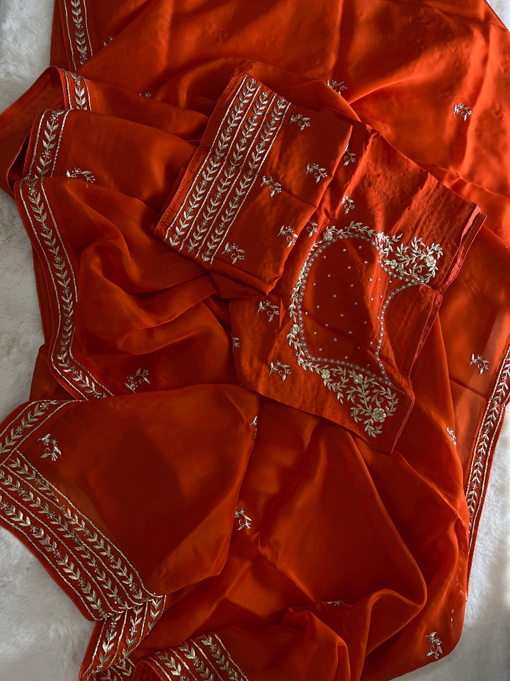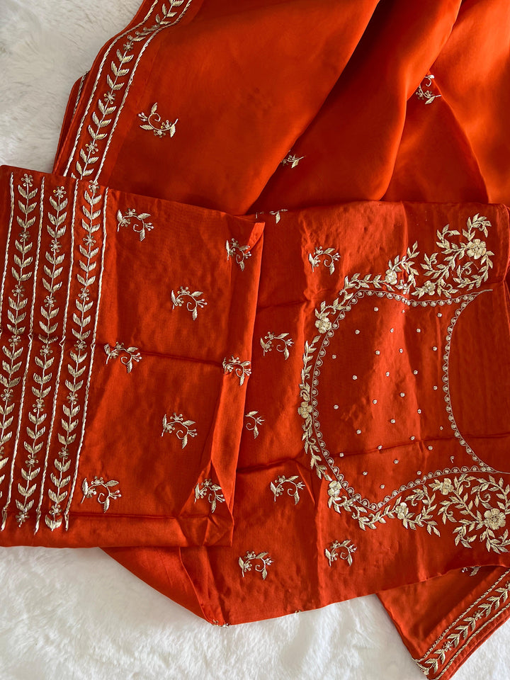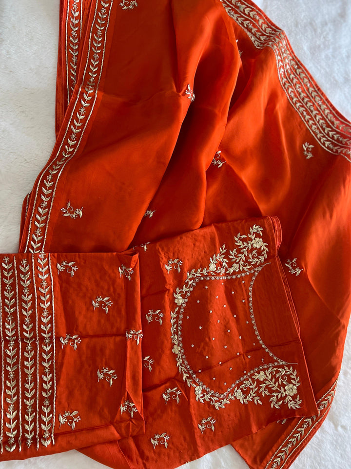 This exquisite Orange Georgette Organza Silk Saree offers a luxurious fall and fluid drape, making it perfect for weddings, festive soirées, and vibrant celebrations. Adorned with all-over Zardozi handwork, it reflects a timeless blend of tradition and artisanal finesse ✨❣️