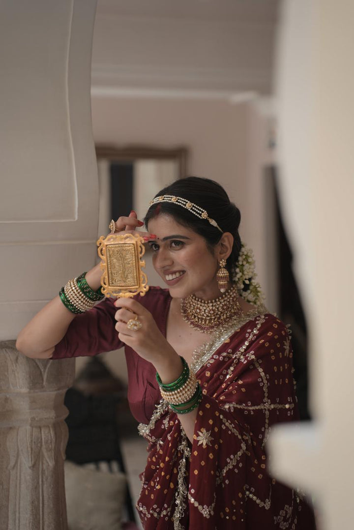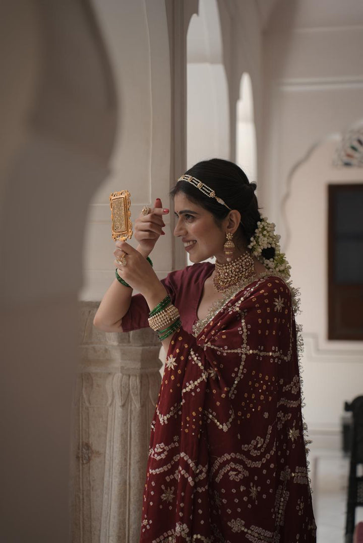 Drape yourself in timeless charm with this Deep Mehroon Pure Modal Silk Bandhej Saree, adorned with exquisite Gota Patti & Zardozi handwork all over. A stunning fusion of regal craftsmanship and traditional allure, this saree exudes festive luxury in every fold. Comes with a matching running blouse to complete the look. 💕