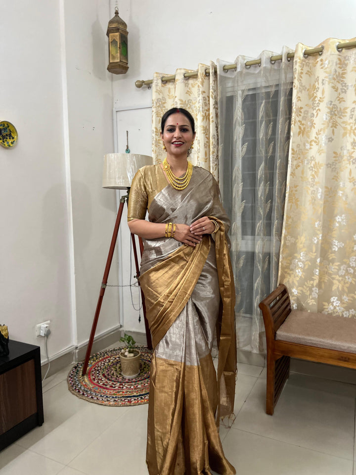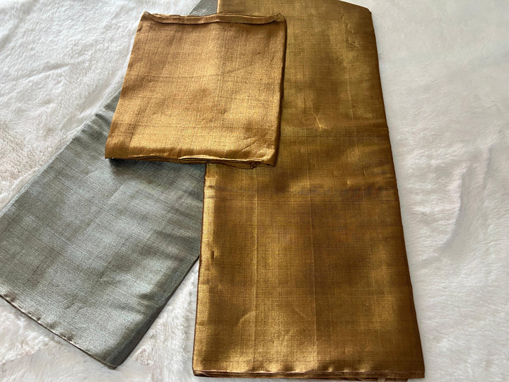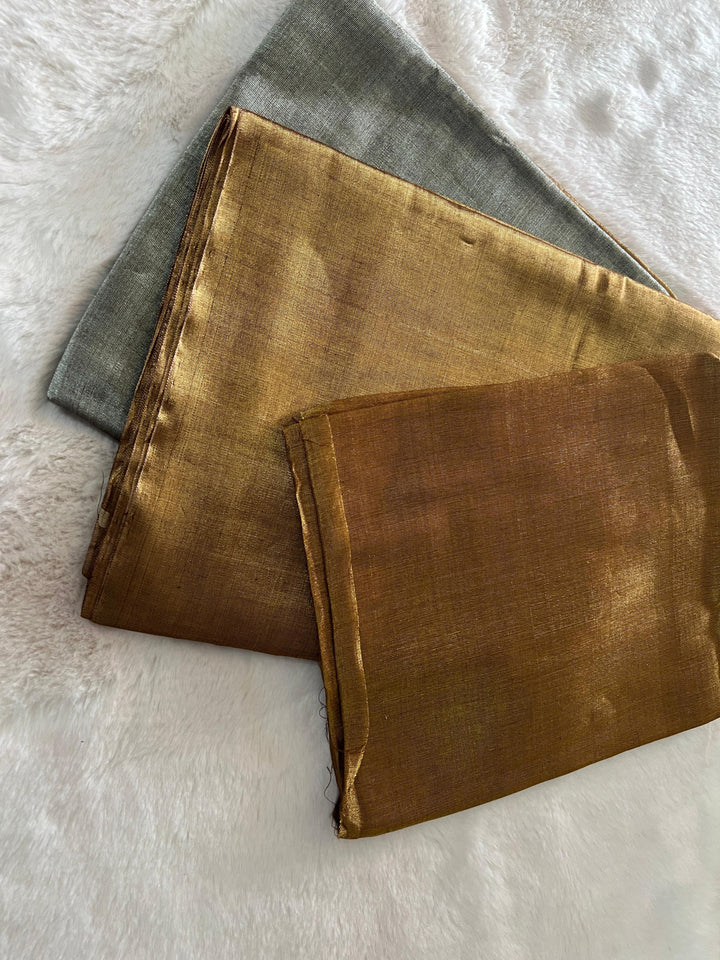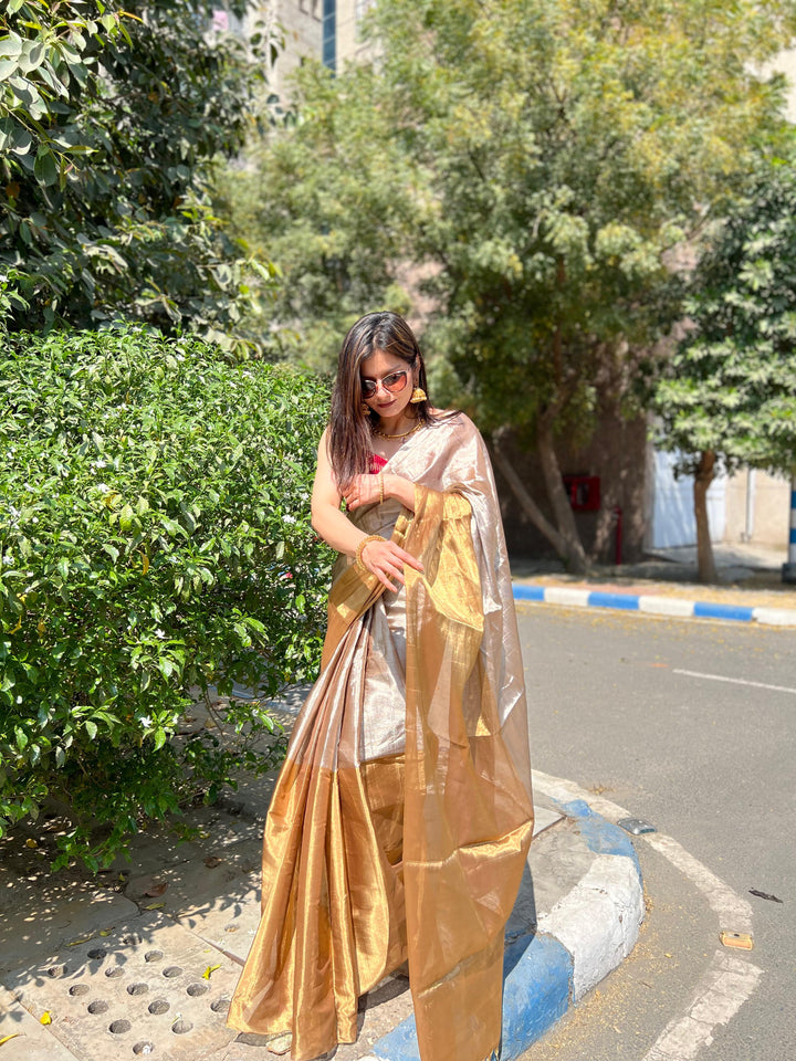 An evergreen beauty — this Golden & Silver Handloom Pure Chanderi Cotton Silk Tissue Saree exudes timeless sophistication. Woven with love and grace, its ethereal shimmer and luxurious fall make it perfect for those who love subtle opulence. Paired with a matching running golden tissue blouse, this drape is a graceful statement in itself 🌾🪔👑