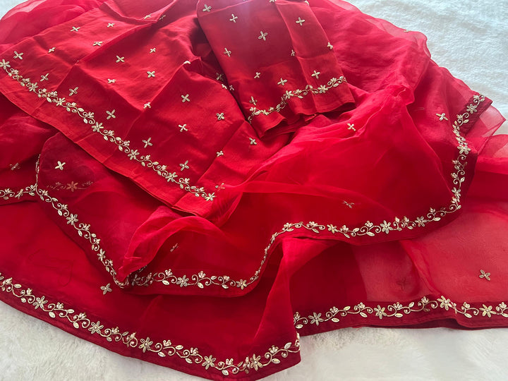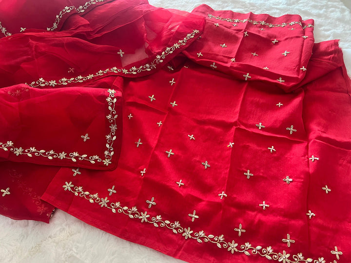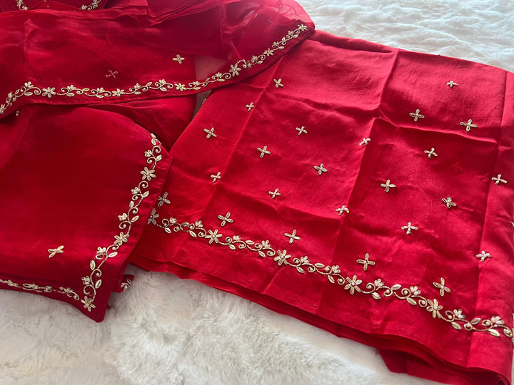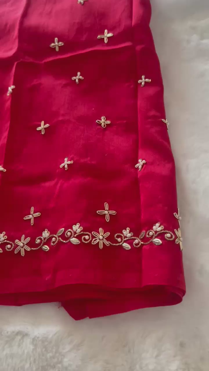 An epitome of elegance — this Pure Organza Silk Red Saree is delicately adorned with beautiful handwork, radiating festive charm and grace ❣. Paired with a luxurious Chanderi Silk Blouse, it’s the perfect pick for weddings, festivities, and special occasions.