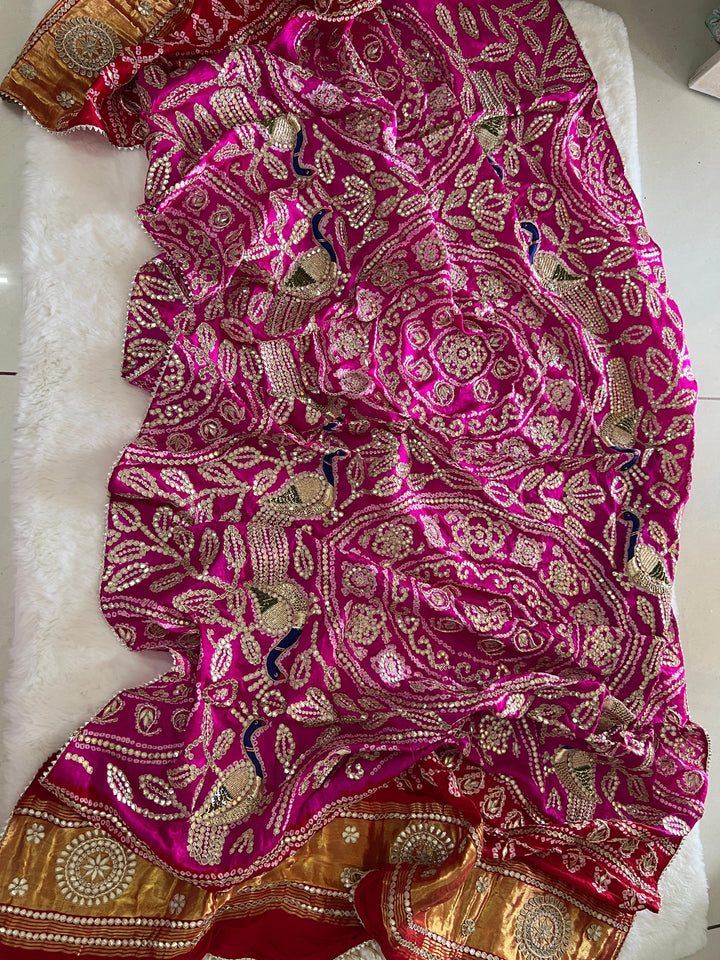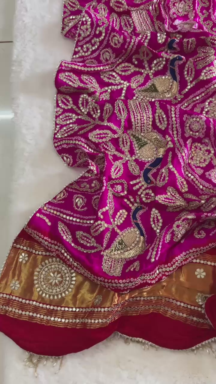 Presenting मोर, a luxurious Red Rani Pure Gajji Silk Rai Bandhej Dupatta, exquisitely adorned with fine Zardozi, Sitara, Marodi, and Dabka handwork, celebrating the grandeur of traditional Indian artistry. Each handcrafted motif reflects heritage elegance, making it a treasured pick for bridal rituals, shagan ceremonies, weddings, and trousseau collections.