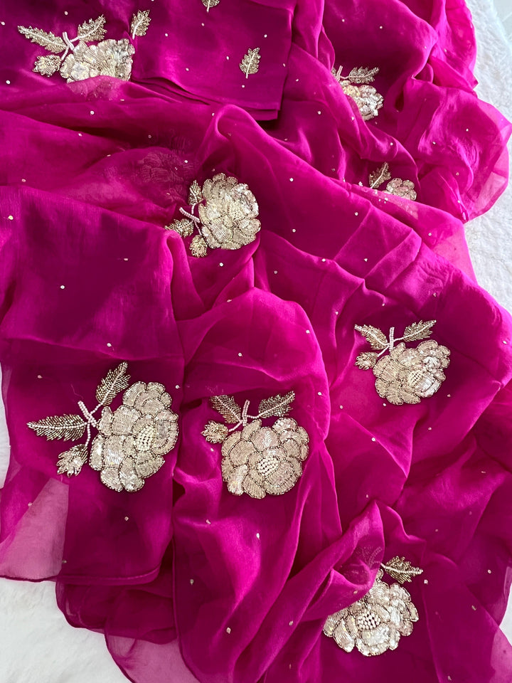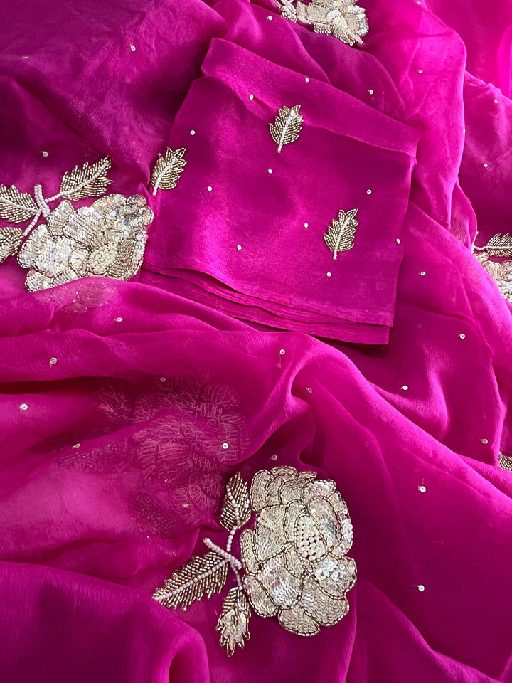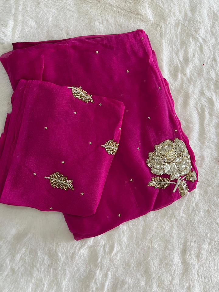 Soft, romantic, and oh-so-elegant — our Diamond Chiffon Saree is adorned with intricate rose flower buttas crafted in Aari Taari, Sequins, and Cutdana work, making it a dreamy blend of grace and shimmer. ✨ Comes with a Crepe blouse piece beautifully detailed on the sleeves for that delicate finish.