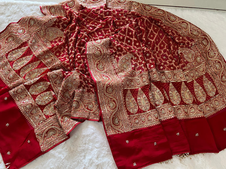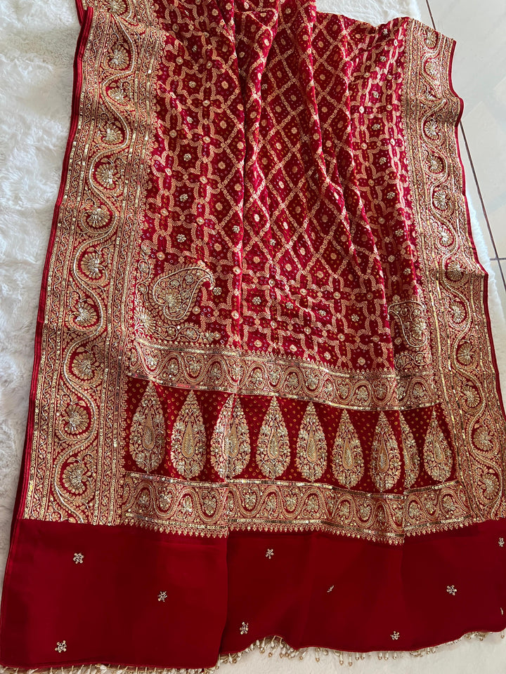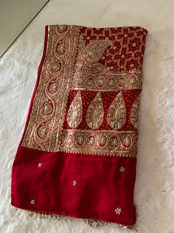 Celebrate tradition in its most elegant form with our Red Pure Georgette Neemzari Dupatta, exquisitely adorned with fine Zardozi, Marodi, and Dabka handwork. Every thread tells a tale of timeless artistry, making it the perfect pick for pre-wedding rituals, bridal gifting, or festive styling. πŸ’«πŸ’•