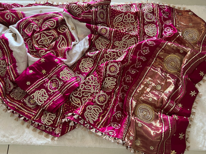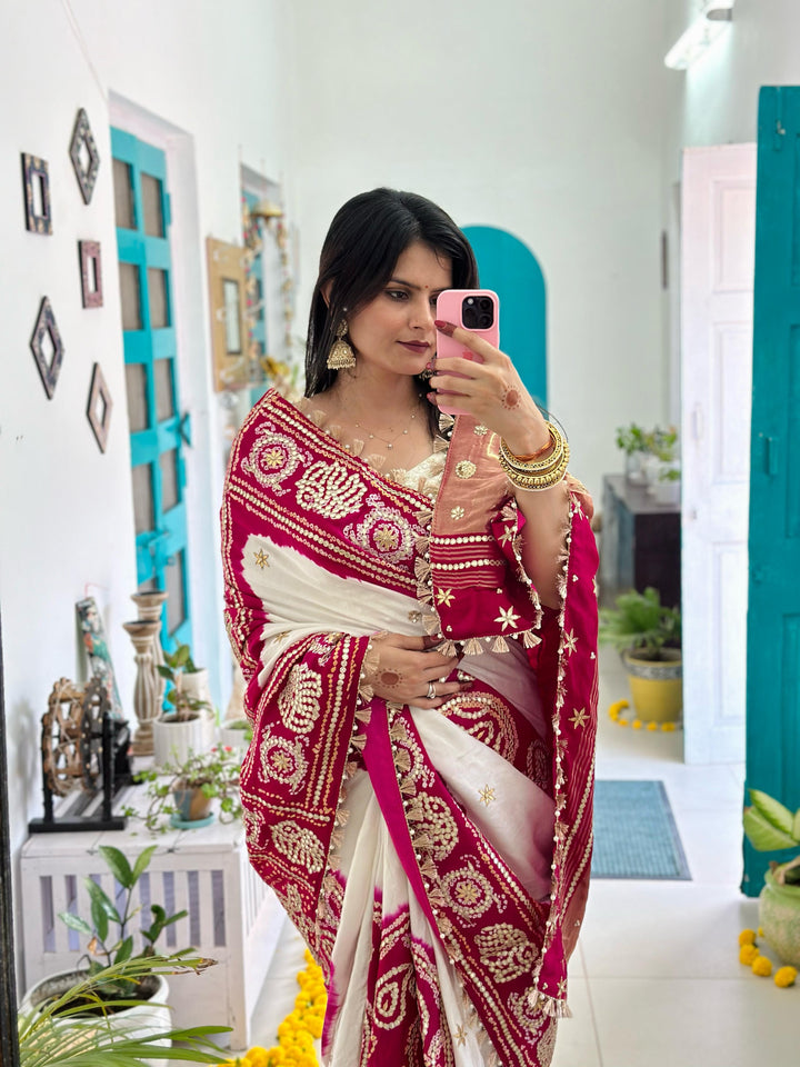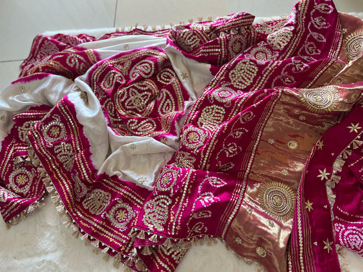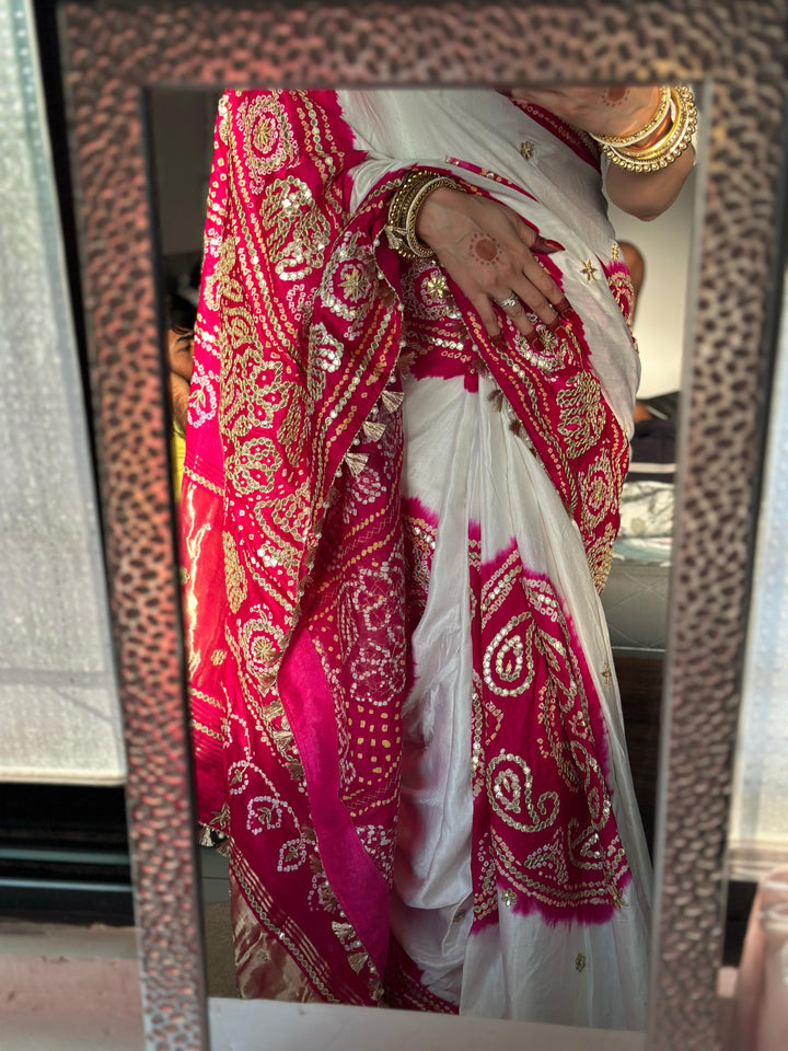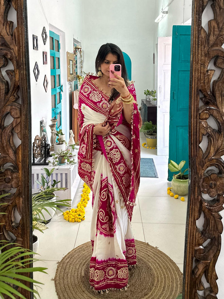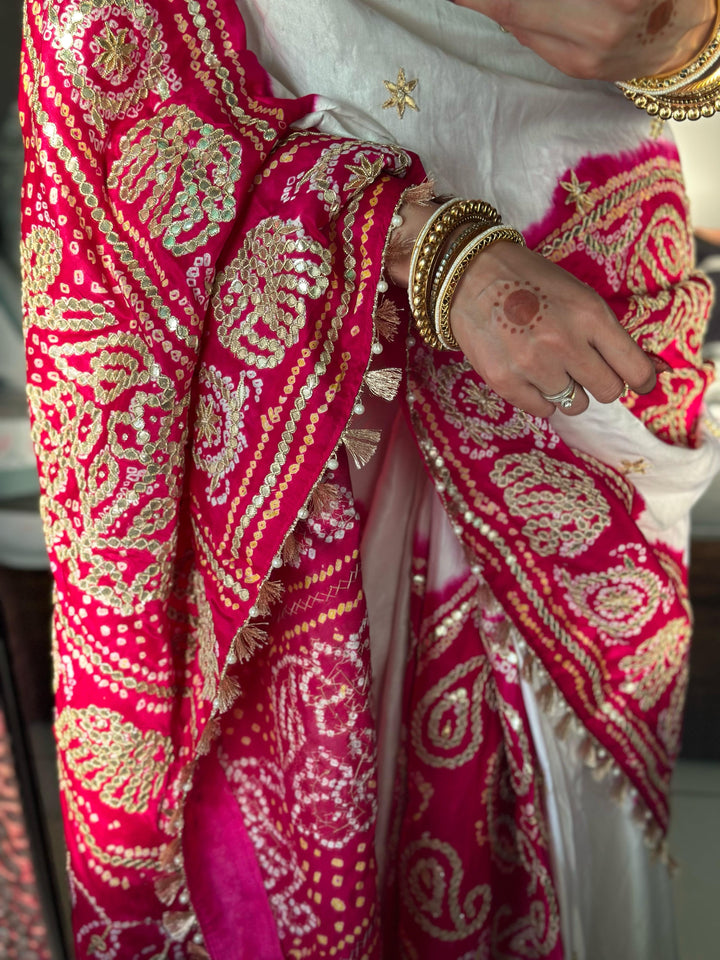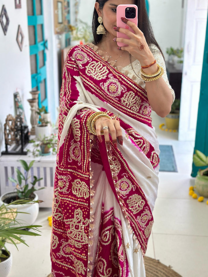 Fabric : Pure Gajji Silk Handwoven Rai Bandhej White & Rani Coloured Saree