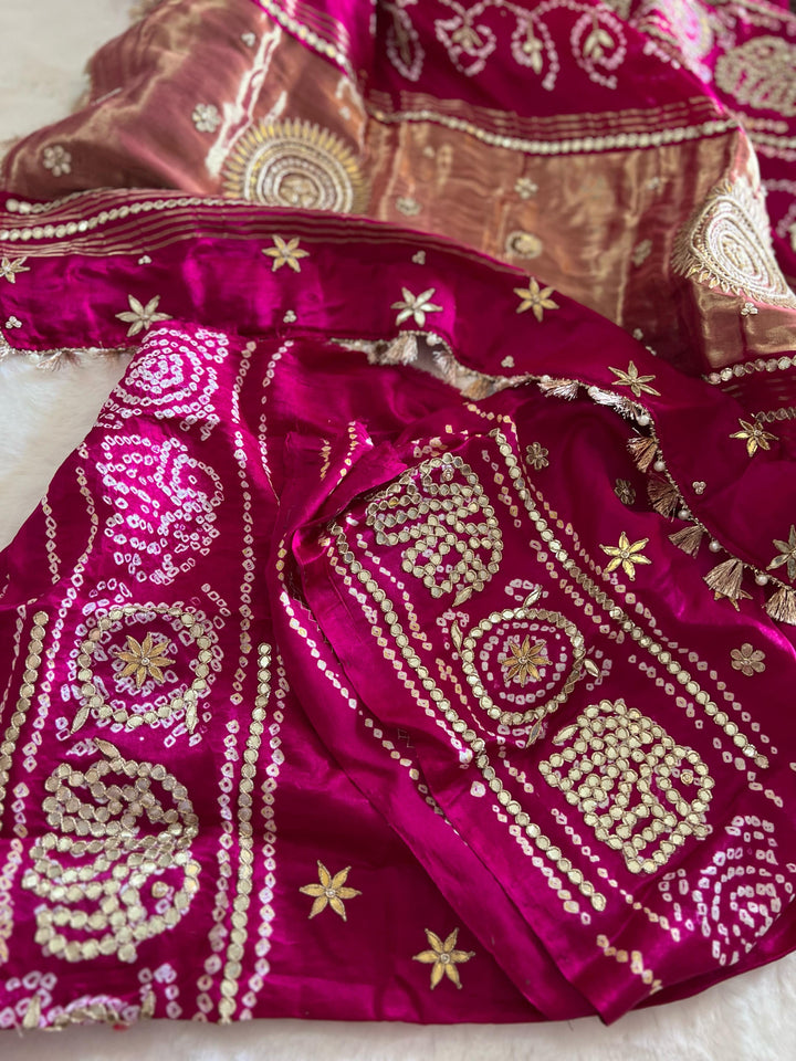 The 🌷Gulkhera🌷 Saree is a breathtaking fusion of traditional artistry and luxurious fabric. Crafted from pure Gajji silk, this handwoven saree features a striking blend of white and rani colors, creating a vibrant yet elegant appeal. The saree is exquisitely enhanced with intricate handwork, including Gotapatti, Zardozi, and Dori mix embroidery, which adds an opulent and detailed touch to the design. The rich embellishments create a beautiful contrast against the soft fabric, making it perfect for grand occasions. Paired with a blouse adorned with matching handwork, this saree is a true representation of craftsmanship, offering a timeless and regal look for any special celebration.