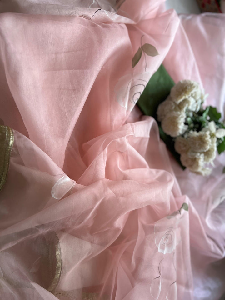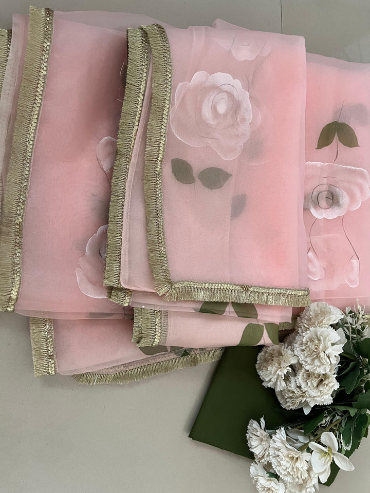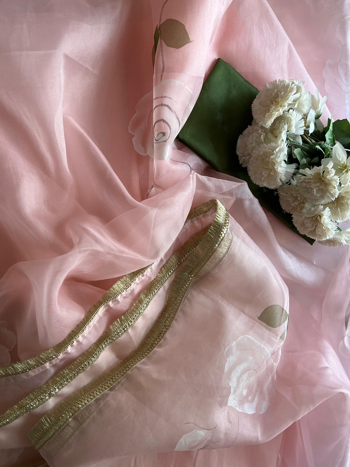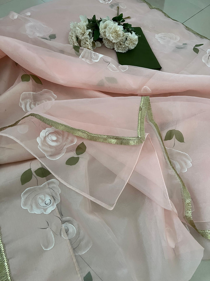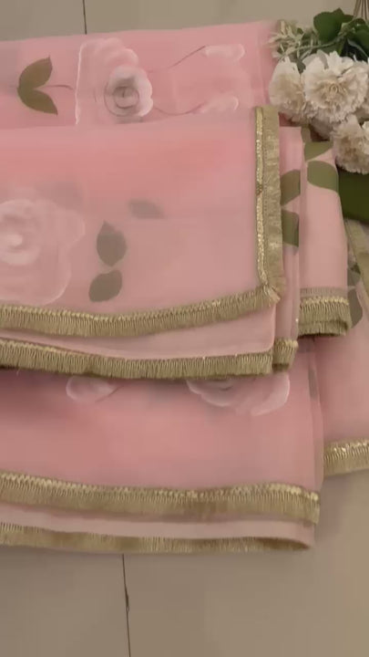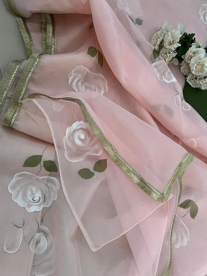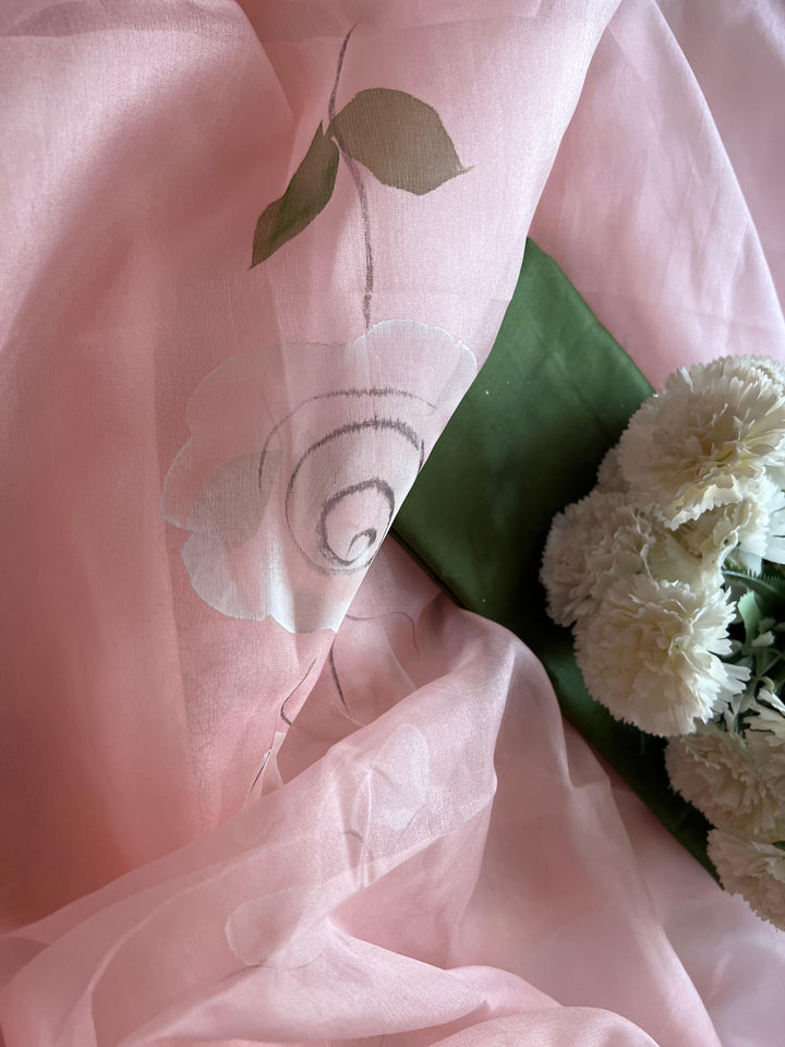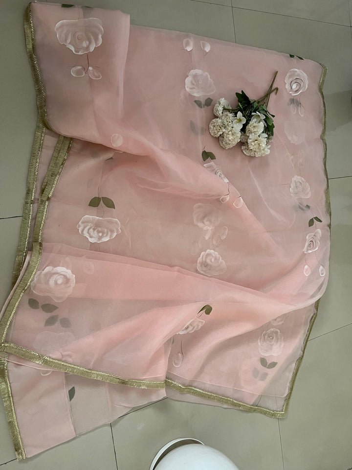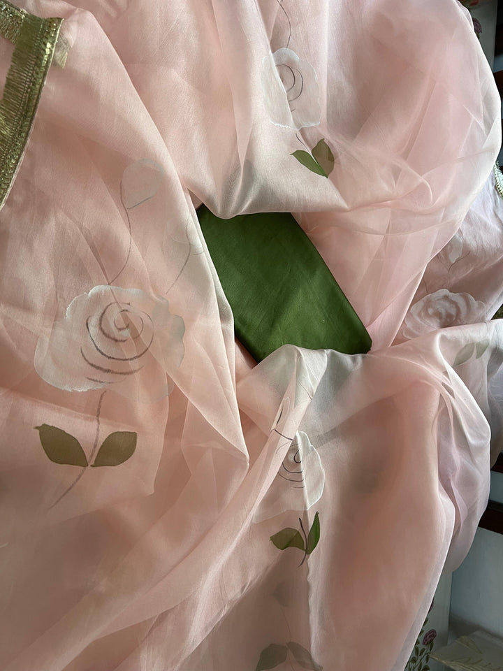 Fall in love with this light peach soft organza saree, delicately hand-painted with charming rose motifs that bloom across the fabric like poetry. Enhanced with a subtle lace border and paired with a plain contrast green blouse, this piece brings a refreshing elegance to your festive wardrobe 🌿🌹✨