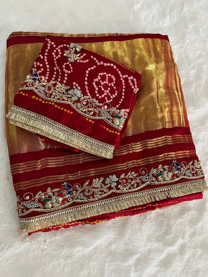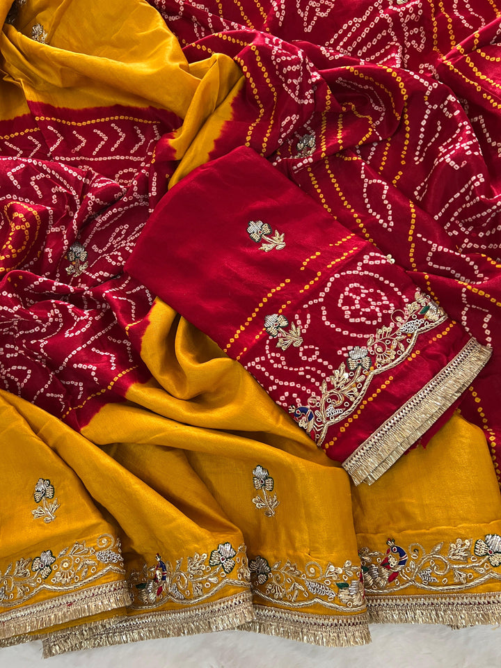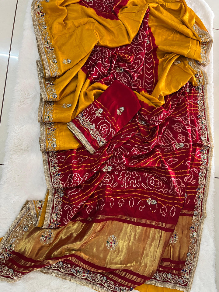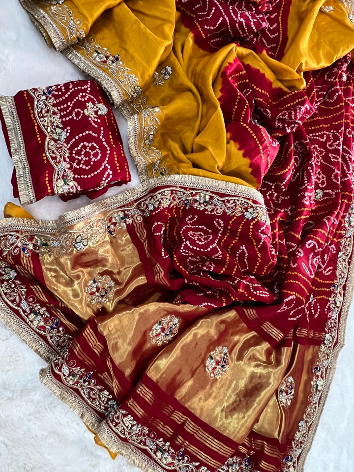 A radiant heirloom for your festive wardrobe โจ. This Pure Gajji Silk Handwoven Rai Bandhej Saree in striking Red & Mustard hues is adorned with exquisite Gotapatti, Zardozi & Dori Mix Handwork, exuding regal elegance. The saree is paired with a beautifully hand worked blouse, completing the look with timeless sophistication ๐โค๏ธ.