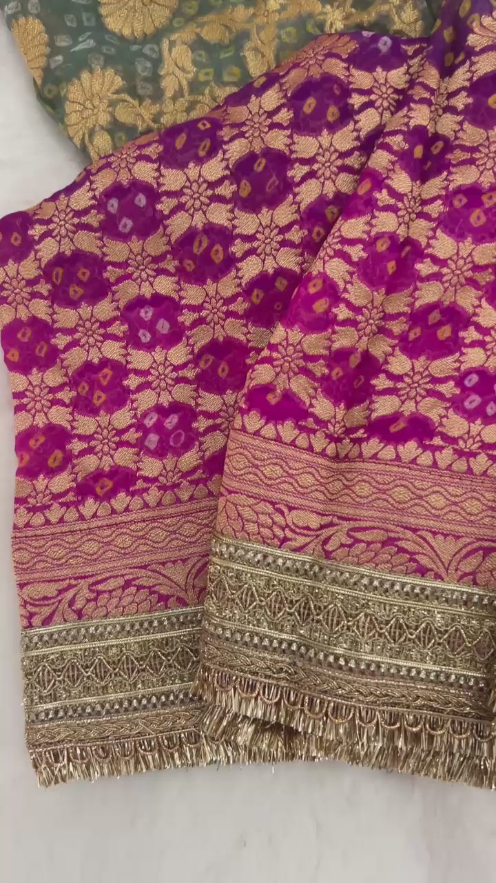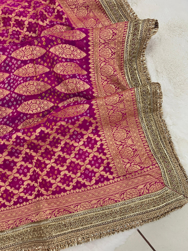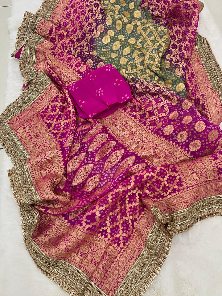 A timeless beauty inspired by regal charm, this Pure Georgette Rai Bandhej Gharchola Bandhani Saree is the epitome of grace and tradition. Enhanced with delicate lace detailing all over, it radiates elegance while keeping the roots of heritage alive. Paired with a matching Pure Georgette Bandhej blouse, this saree is a celebration of culture, perfect for weddings, festivals & grand occasions. πΈβ¨