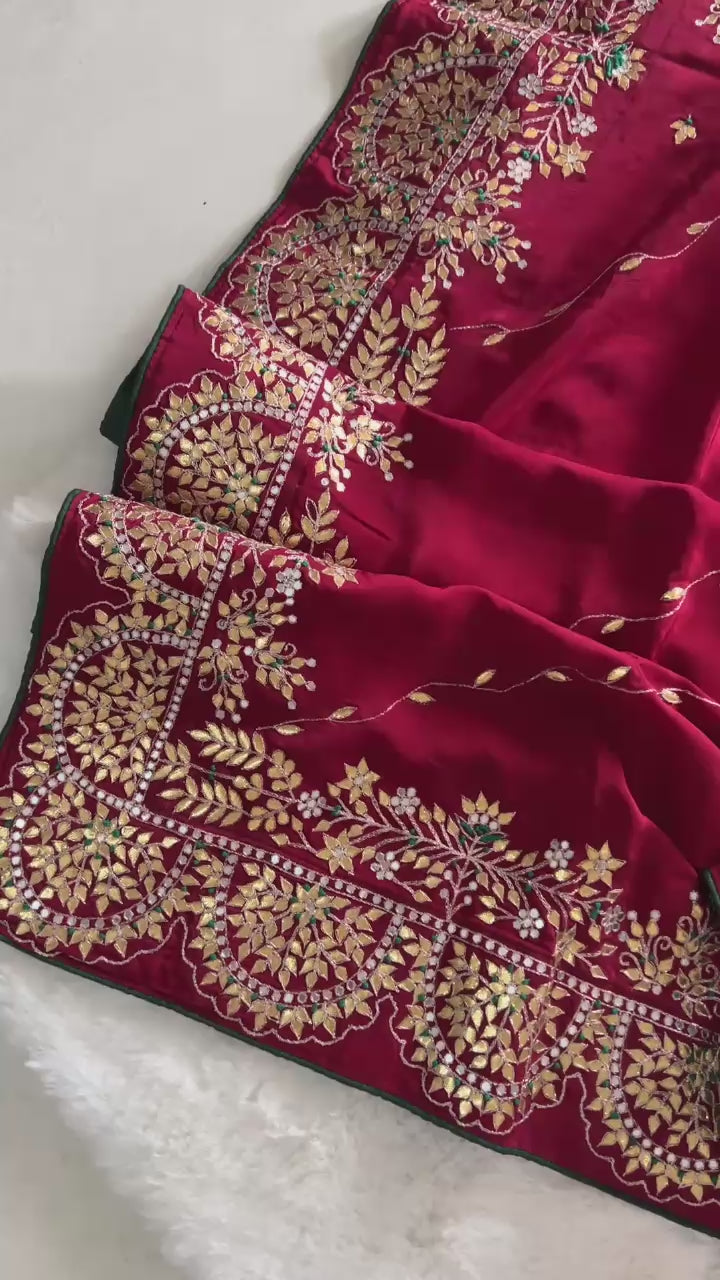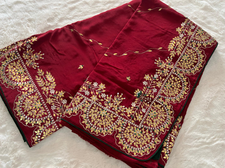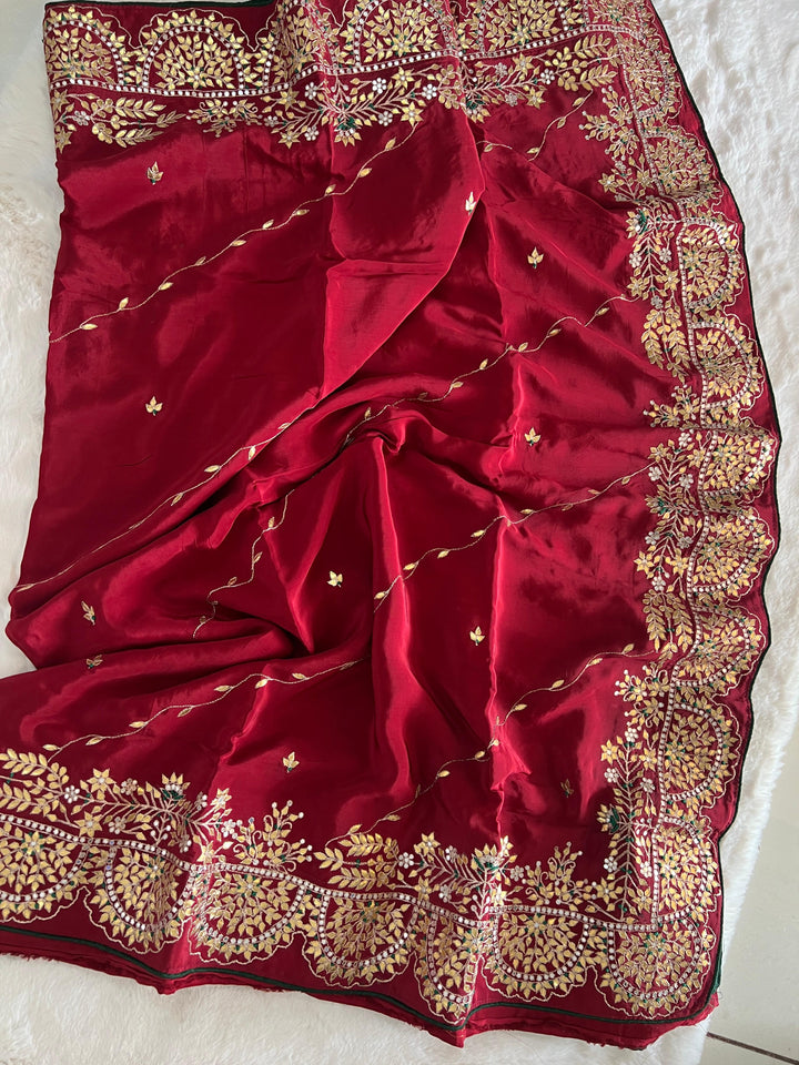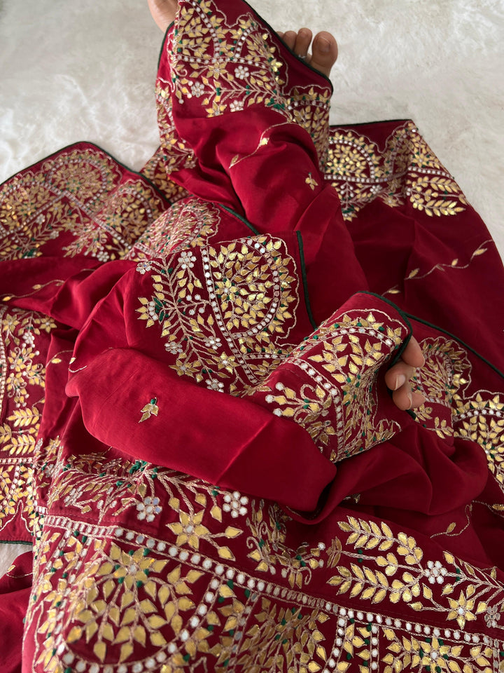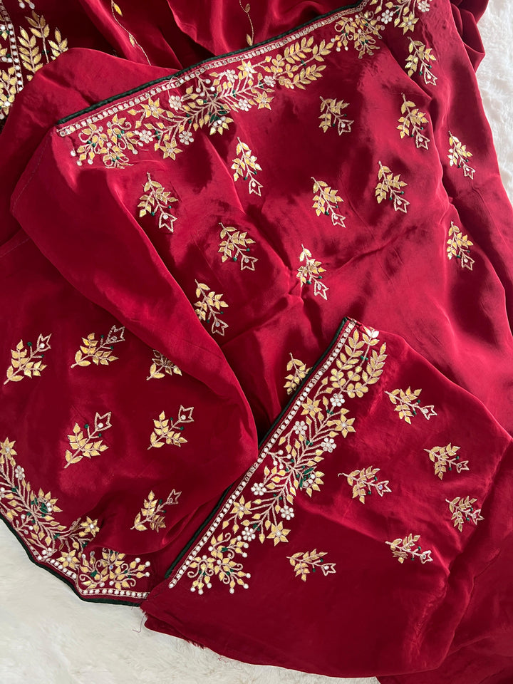 Drape yourself in the allure of mehroonish red satin silk organza, adorned with intricate gotapatti & resham handwork that exudes regal charm. The heavy blouse adds a touch of grandeur, making it a statement ensemble for weddings, receptions, or festive soirΓ©es. πΉπ