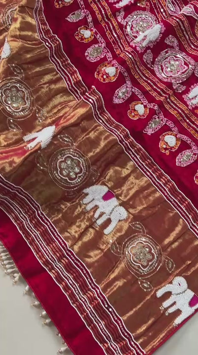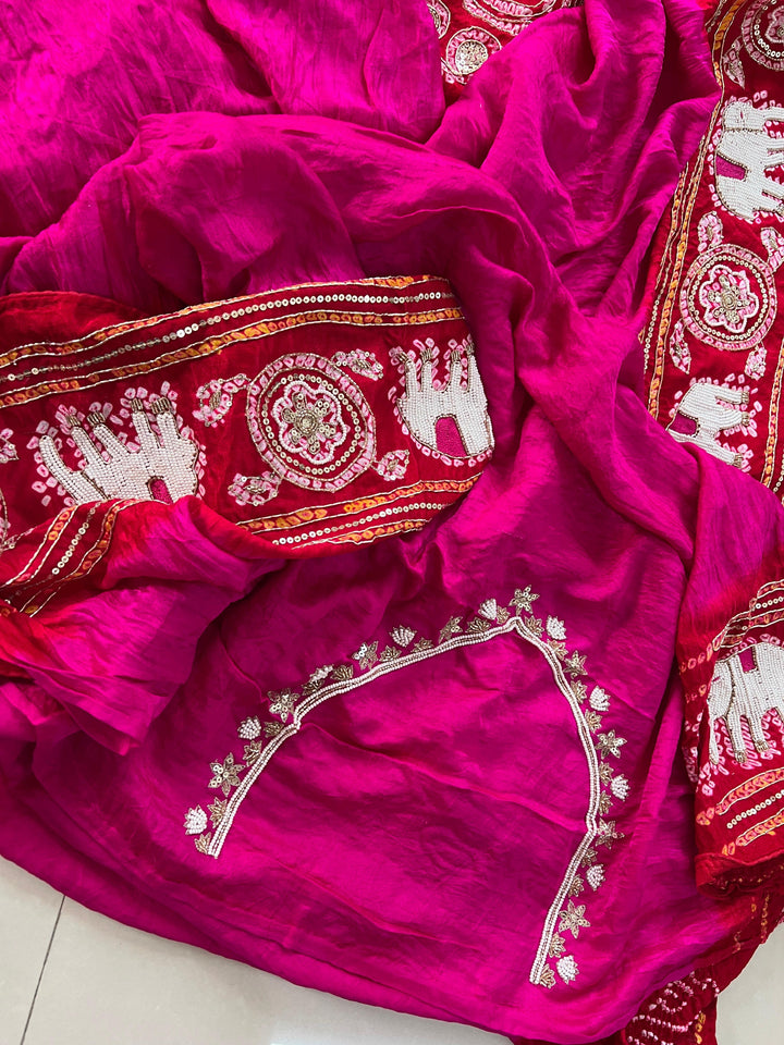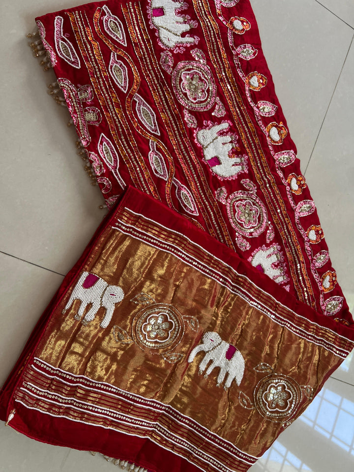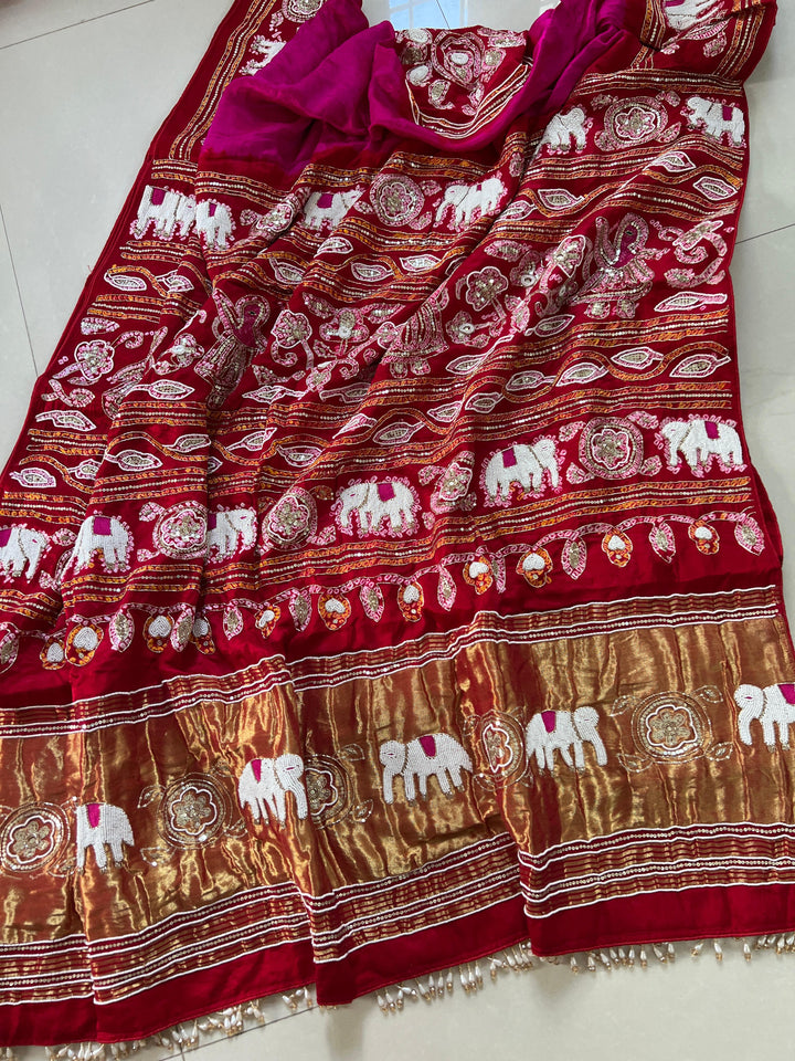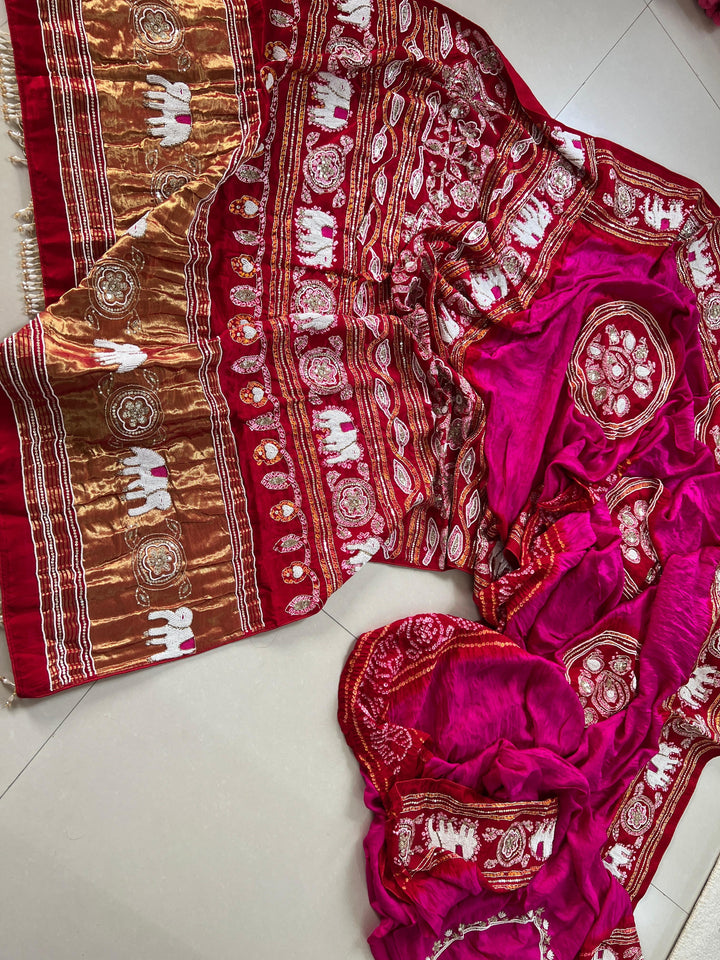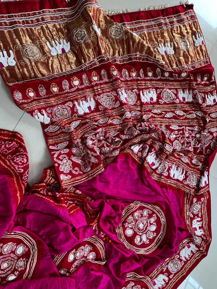 Drape yourself in regal charm with this Pure Gajji Silk Bandhej Saree in a rich Red-Rani blend, exuding festive vibrance and traditional elegance. Intricately enhanced with Gotapatti, Zardozi, Dori, Pearl & Resham Handwork, this saree is a masterstroke of heritage artistry. The matching blouse features detailed embroidery on the neckline and sleeves, completing this graceful ensemble. ๐ŸŒน