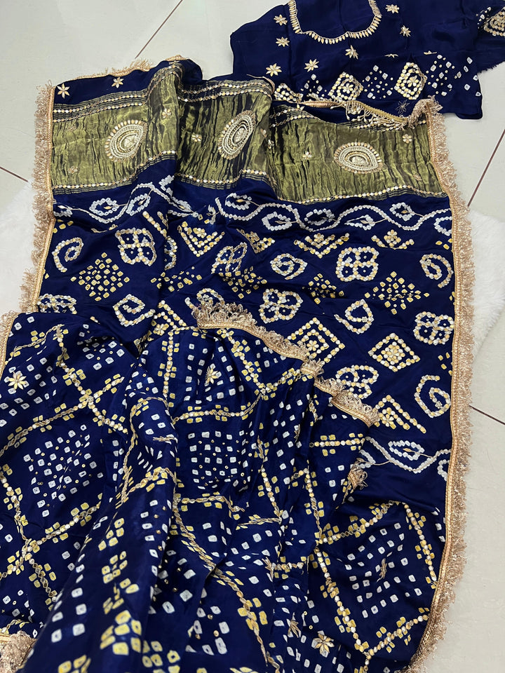 Make an opulent statement in our Exclusive Pure Modal Silk Bandhej Saree, drenched in a stunning Royal Blue hue and elevated with intricate Gotapatti & Zardozi handwork. A true masterpiece of artisanal finesse, this saree is paired with a matching running blouse, making it perfect for weddings, festivities, or grand celebrations. 💫🌸