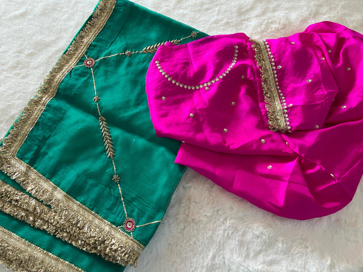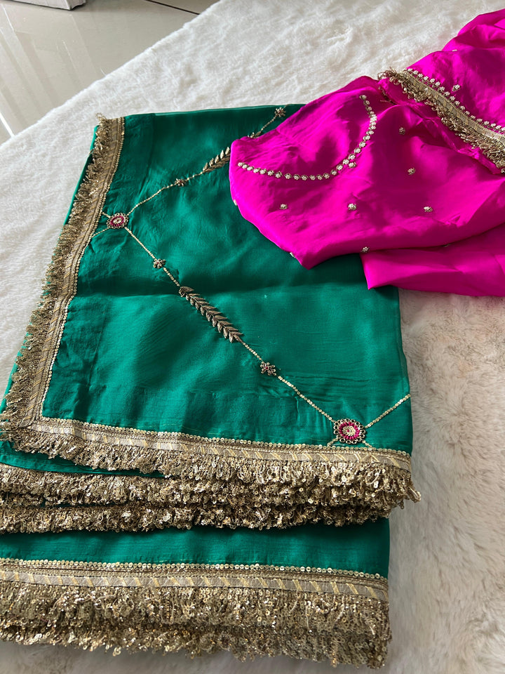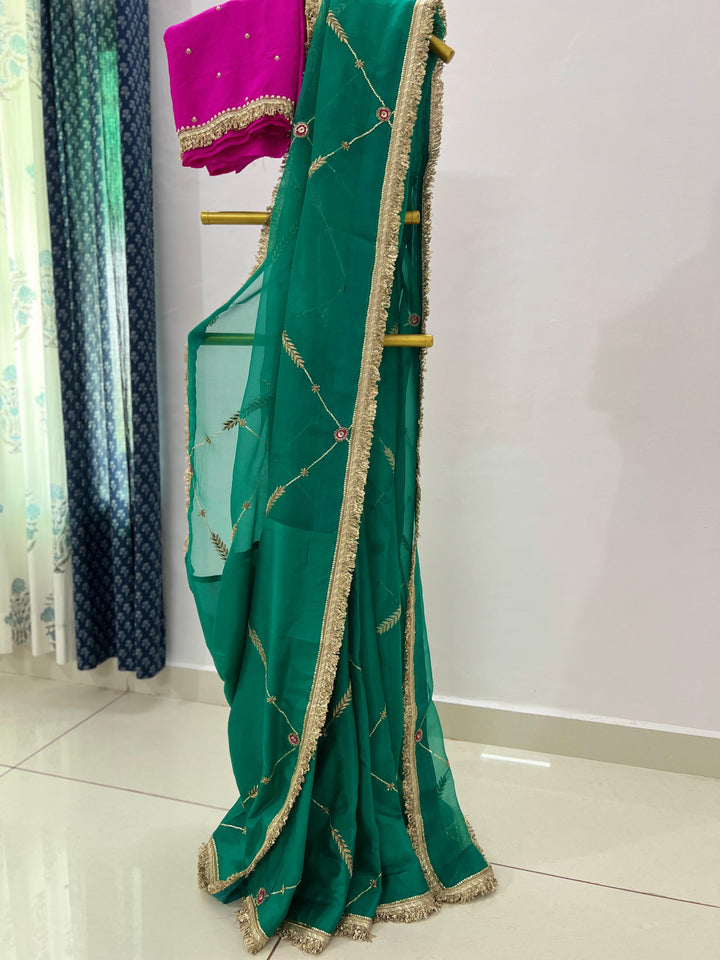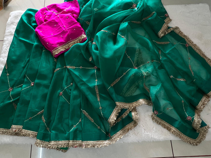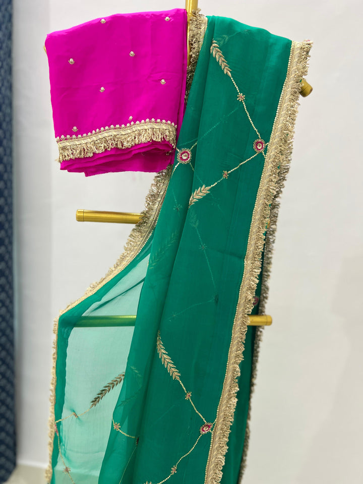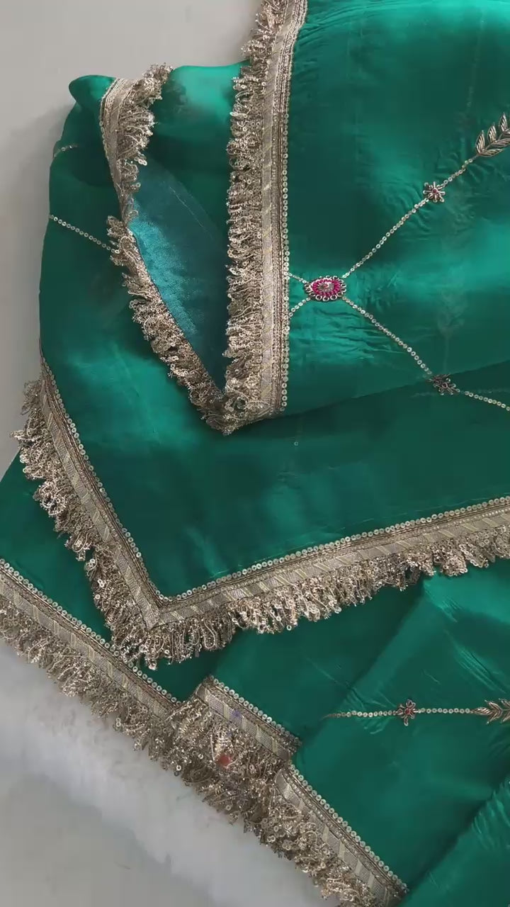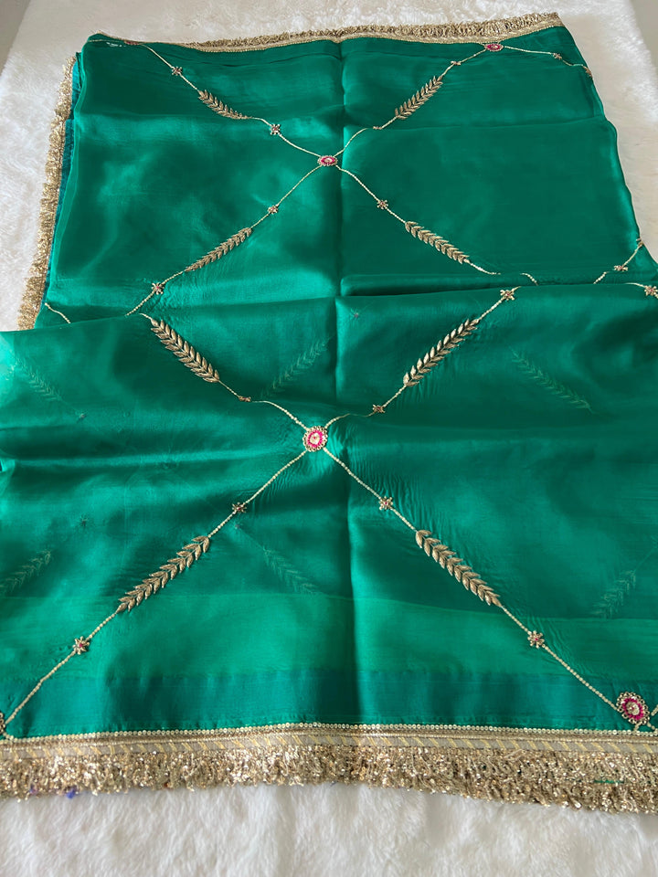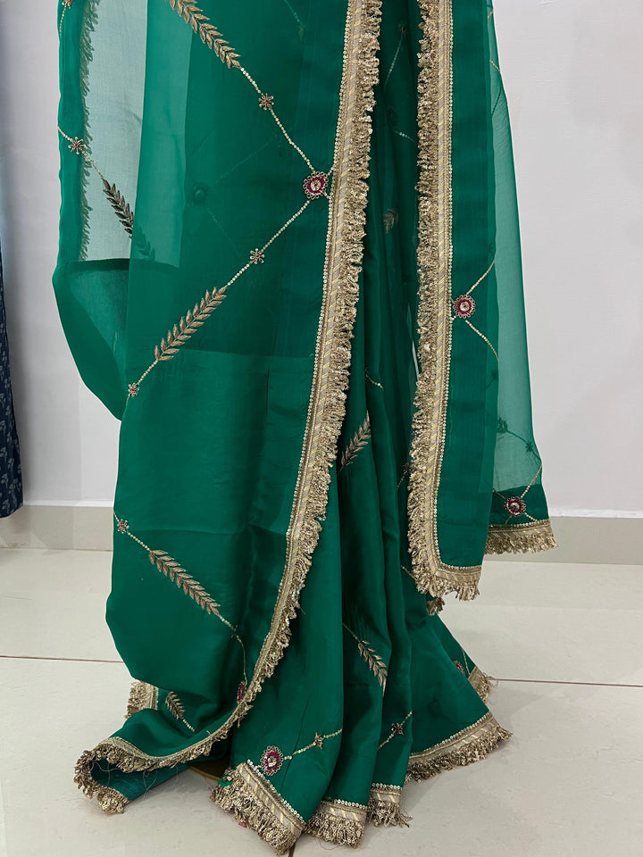 Drape yourself in timeless elegance with this beautiful shade of green saree, crafted in a unique blend of pure organza silk & silk, giving it a perfect fall & fluid drape. Enhanced with an all-over zardozi jaal, this masterpiece radiates festive grandeur & regal charm. ✨❣