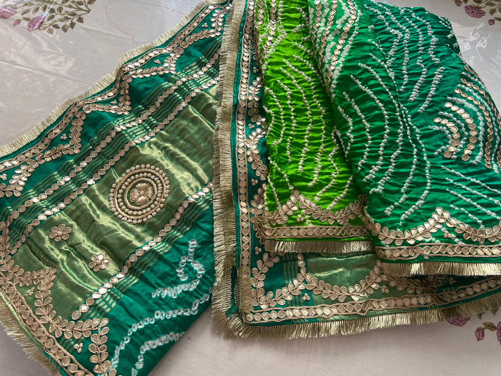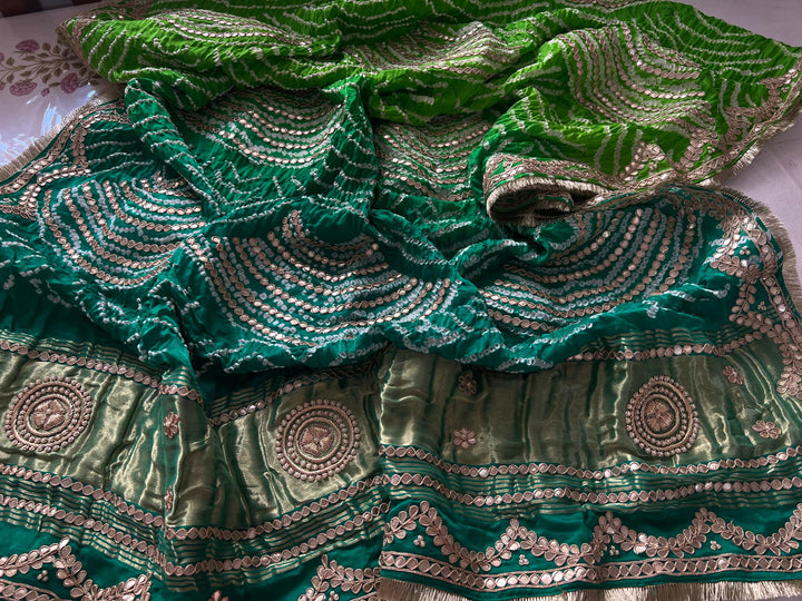 A vibrant symphony of Rama & Parrot Green shades brought together with the elegance of Bandhej and the sparkle of hand embroideryβcrafted for your standout festive moments.