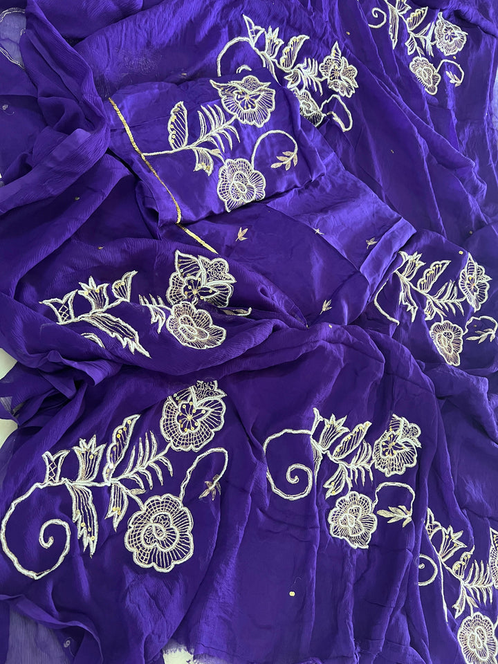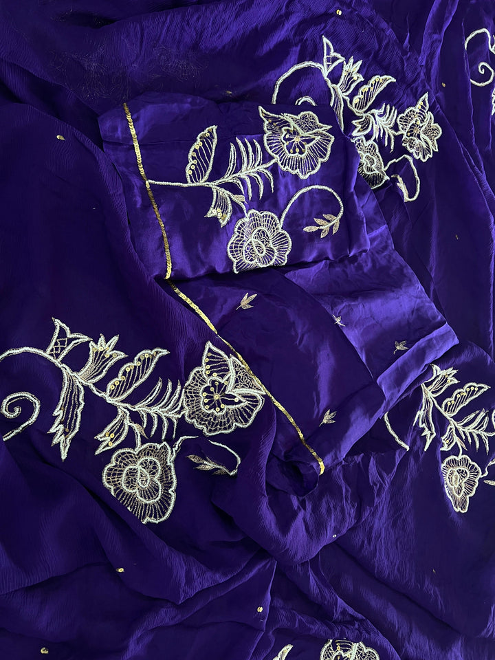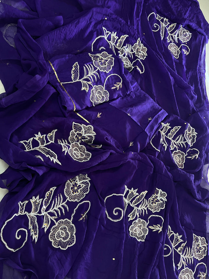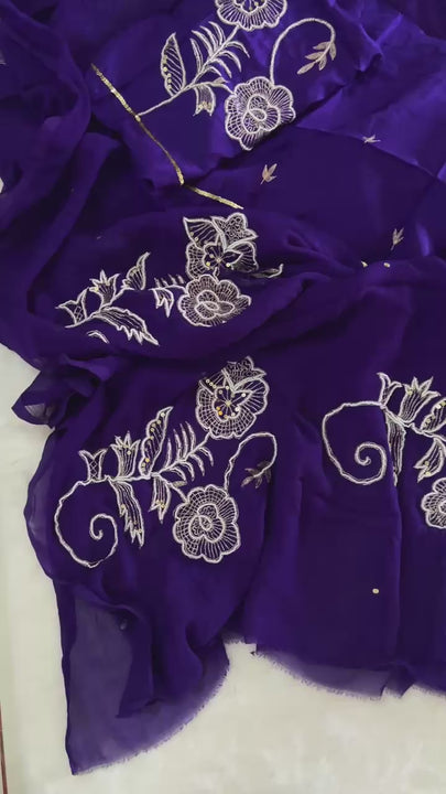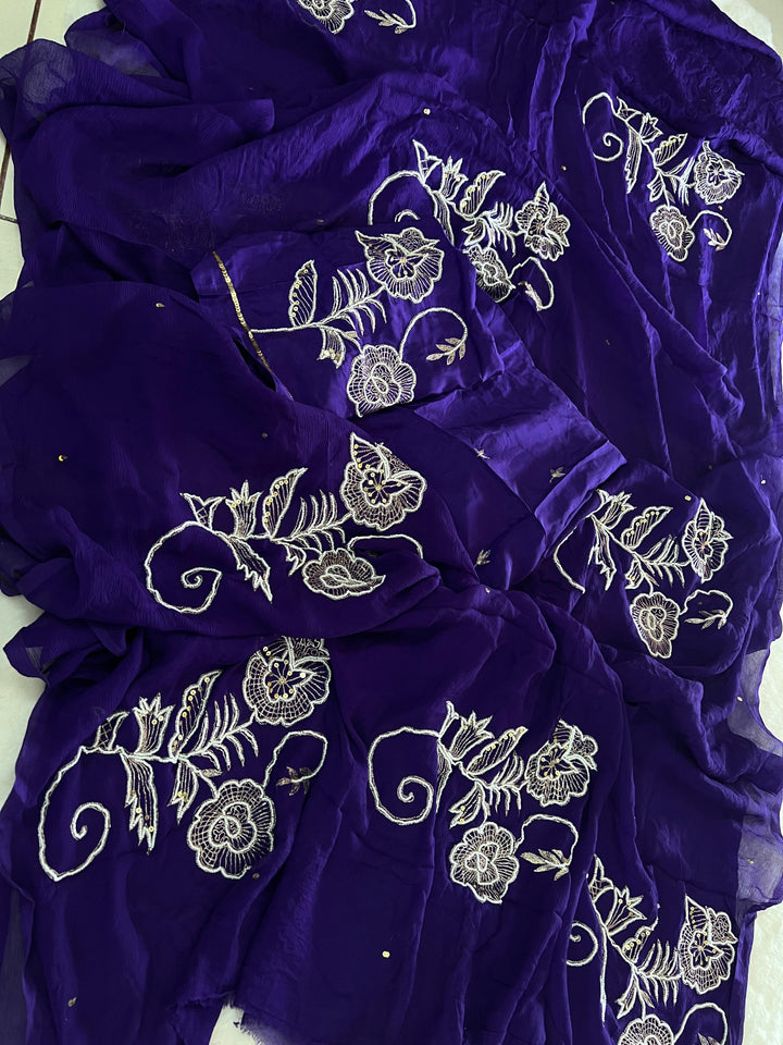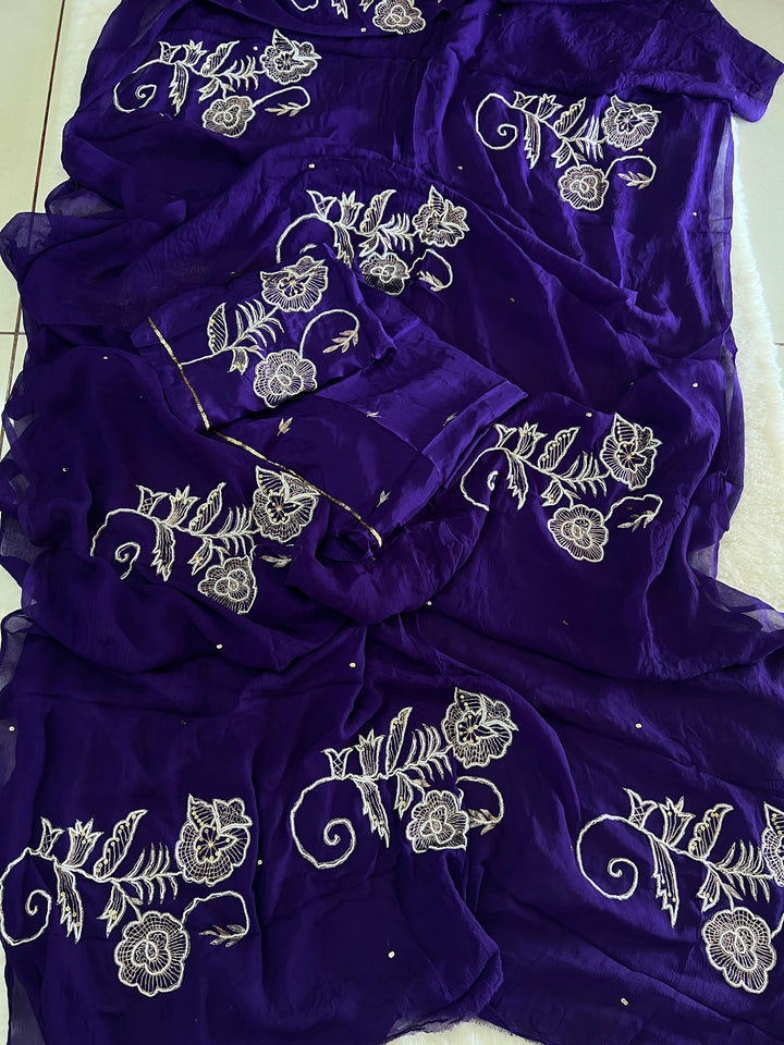 Grace, elegance, and heritage woven into one exquisite drape โจ โ Kusumika is crafted from Pure Double Diamond Chiffon in a rich Royal Purple shade that radiates regal allure. The saree is delicately adorned with pearl and zari handwork motifs, along with a soft taari spray scattered across the fabric, creating a dreamy shimmer with every movement ๐ธ