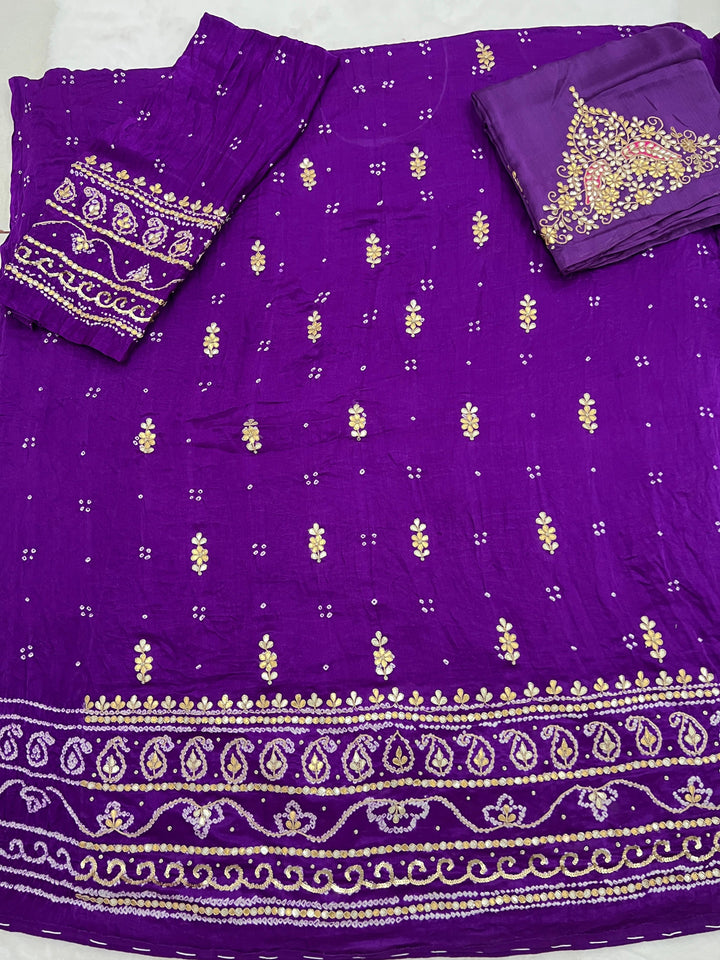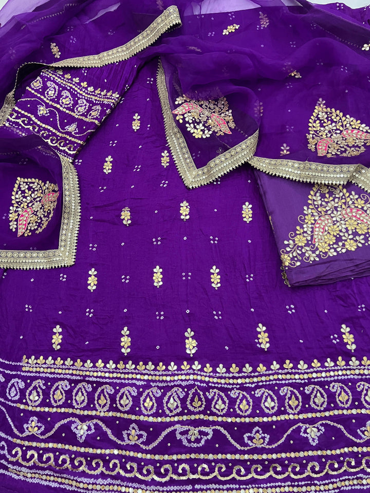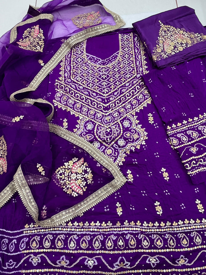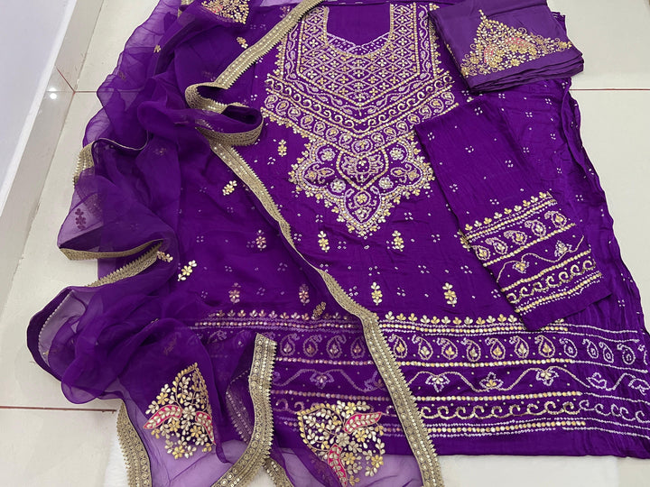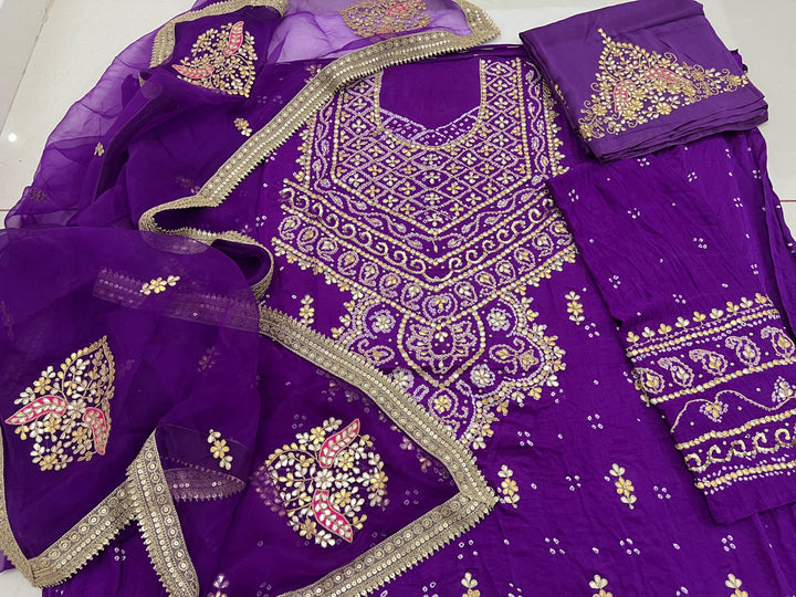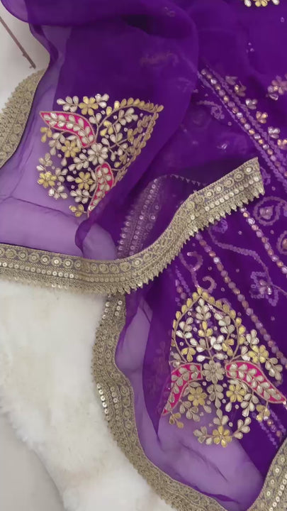 Product available on Pre-Order! π Bandhani Suit Edition π Drape yourself in timeless grace with this Pure Gajji Silk Rai Bandhej Aabha Pattern Kurta, exquisitely adorned with Gotapatti & Marori...