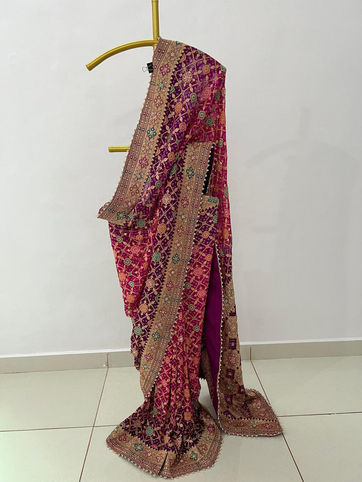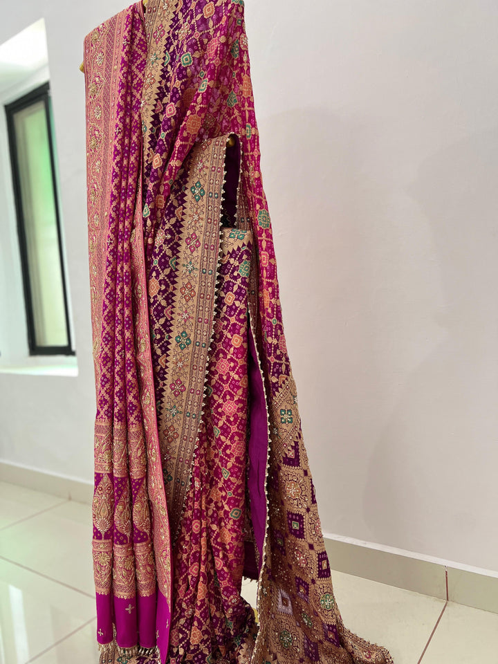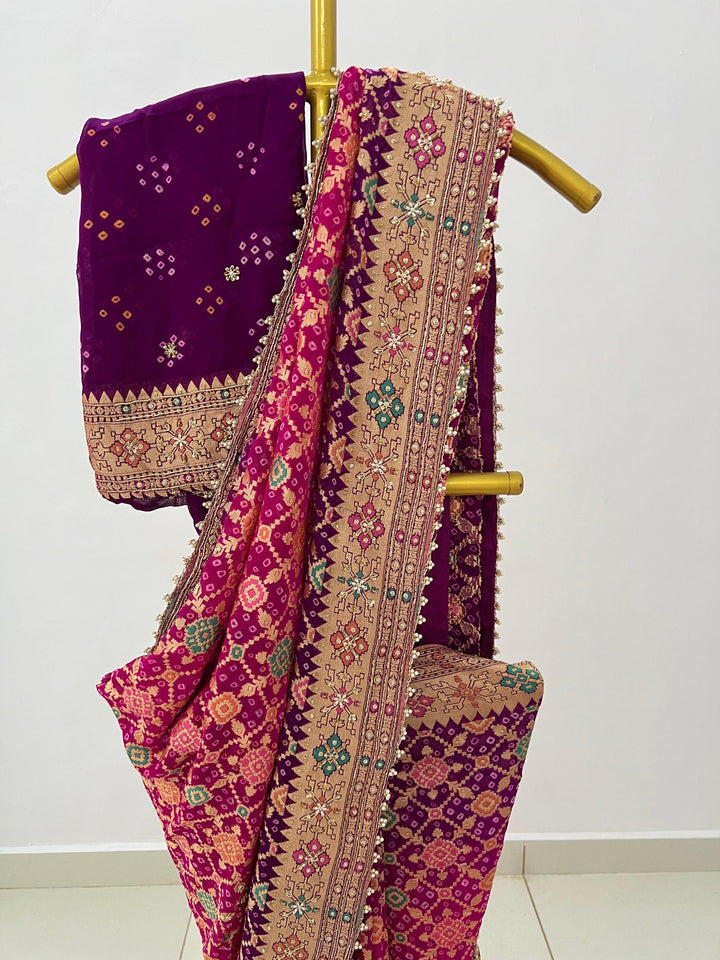 An ode to timeless elegance, this Pure Georgette Rai Bandhej Meenakari Bandhani saree is a masterpiece of tradition, adorned with exquisite gota patti, zardozi, dori & pearl hand detailing. A perfect blend of artistry & grandeur, this drape is crafted for brides, festive occasions, and heirloom wardrobes. 🌸👑