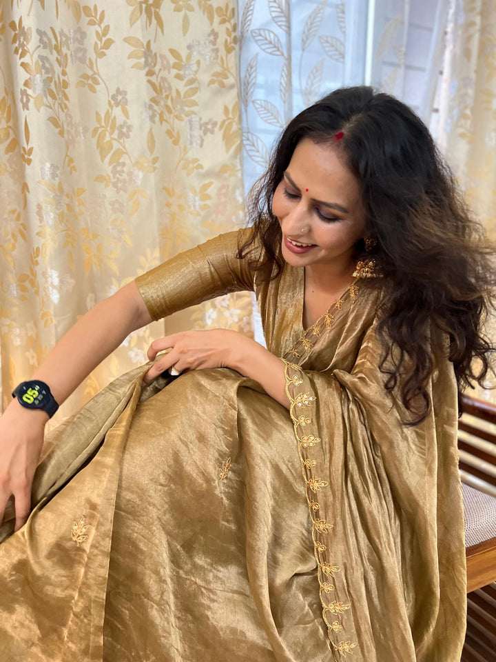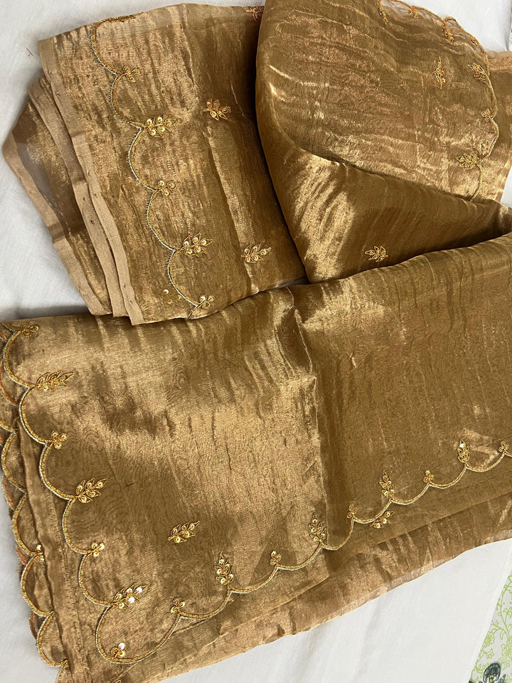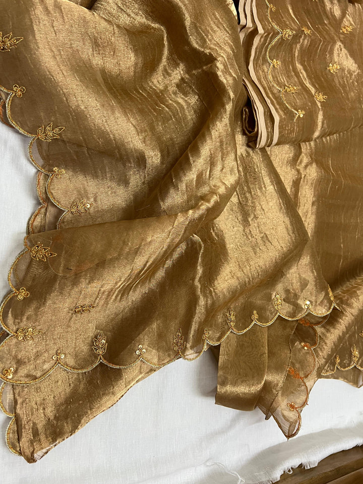 Step into the spotlight with our Sunehri Tissue Saree, a showstopper crafted from Pure Tissue Silk and adorned with exquisite Dori Marori & Sequins Hand Embroidery. The rich, luminous texture paired with delicate detailing gives this saree an ethereal glow. Matched with a Pure Tissue Silk Blouse, itβs the perfect choice for weddings, receptions, or any festive celebration where you wish to dazzle! ππ