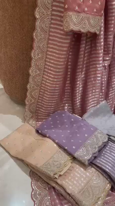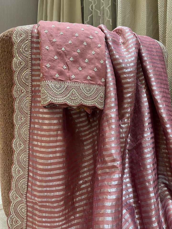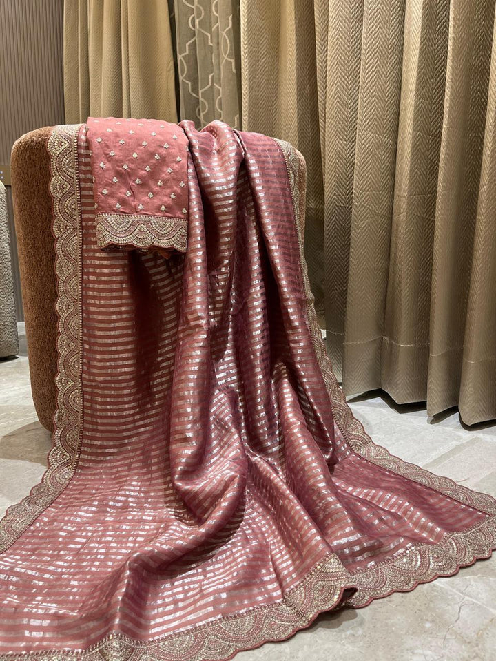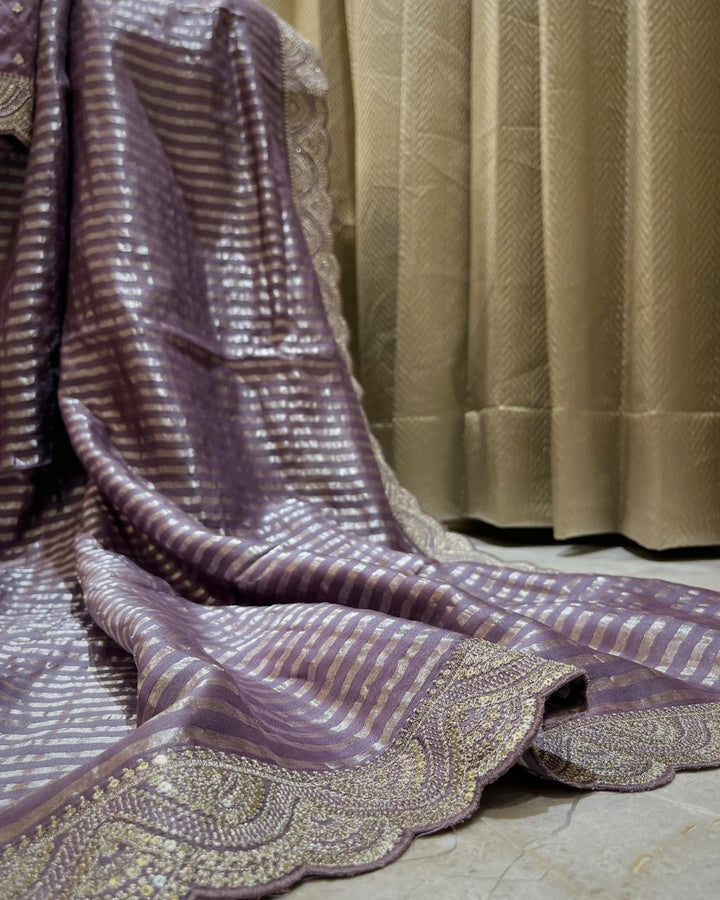 Celebrate understated sophistication in our Pure Chanderi Silk Saree, featuring elegant tissue stripes and a beautifully crafted border that adds just the right touch of finesse. Paired with an embroidered heavy blouse, this drape is a perfect blend of tradition and glamour. 🌸💫