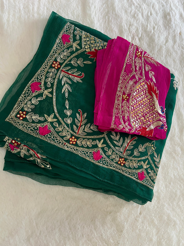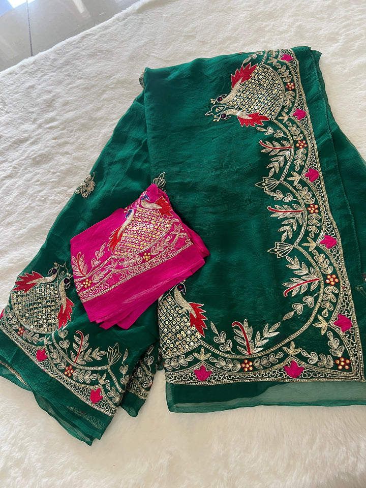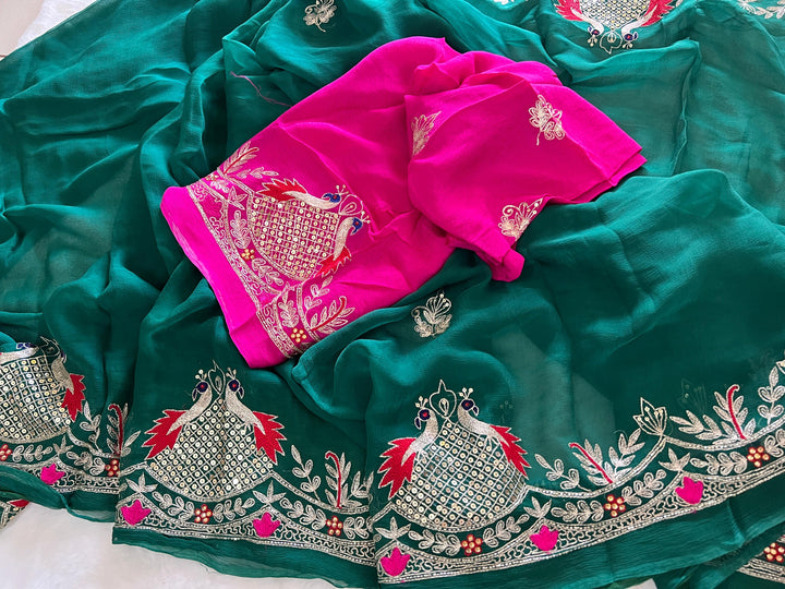 πŸ’« Maharani Heavy Border Peacock Saree πŸ’« A regal masterpiece that celebrates grandeur and artistry β€” our Diamond Chiffon Saree is adorned with an exquisite hand-embroidered border and jaal of...