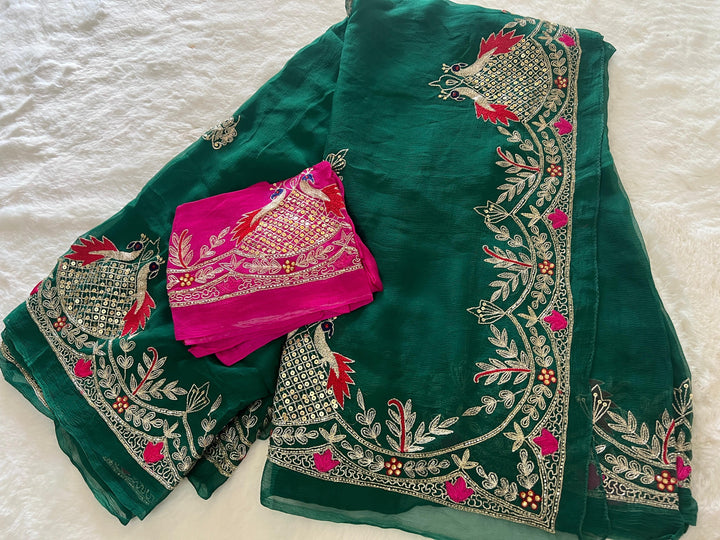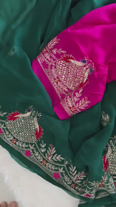 A regal masterpiece that celebrates grandeur and artistry β€” our Diamond Chiffon Saree is adorned with an exquisite hand-embroidered border and jaal of peacocks and florals, meticulously crafted in Aari Taari, Sequins, and Resham. A true statement of royalty, paired with a contrast Crepe blouse featuring matching border detailing on the sleeves. πŸ‘‘