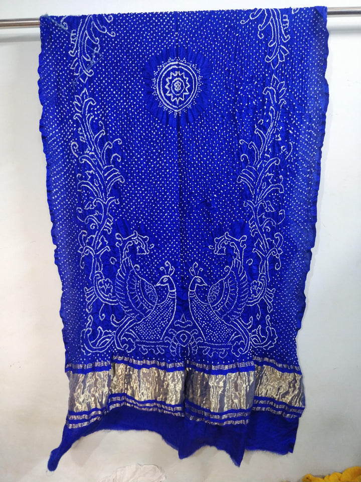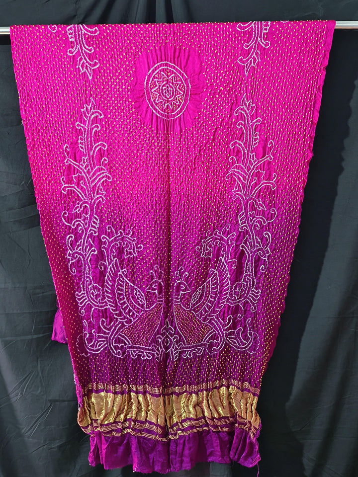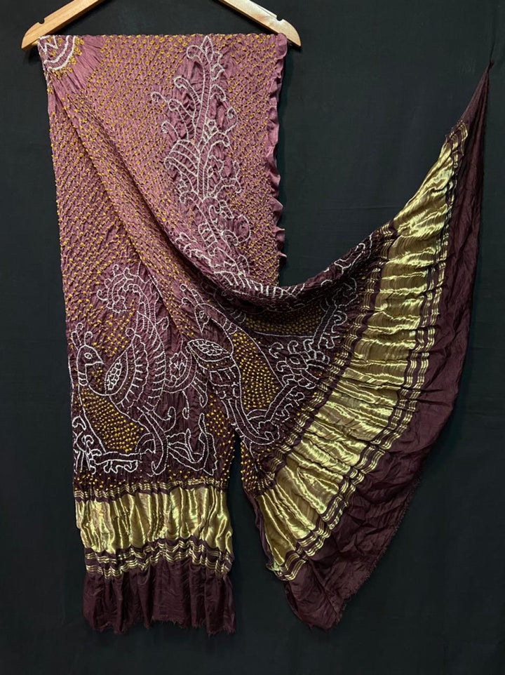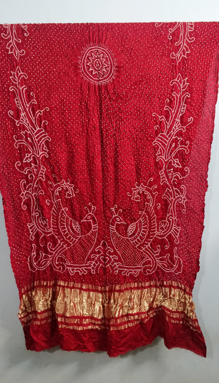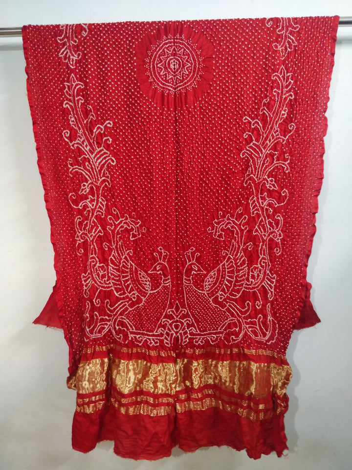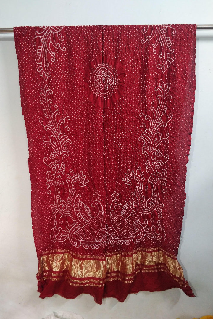 Step into timeless elegance with this royal Bandhani dupatta crafted from luxurious pure Gajji silk. Featuring intricate rai bandhej in a stunning peacock pattern and enhanced with gotapatti handwork, this piece is a true blend of tradition and craftsmanship.