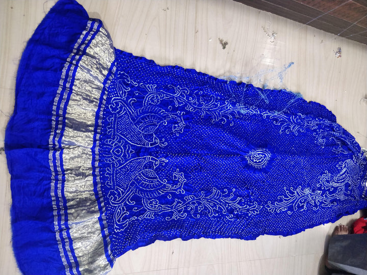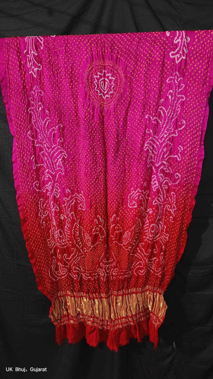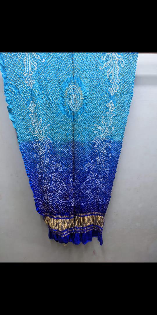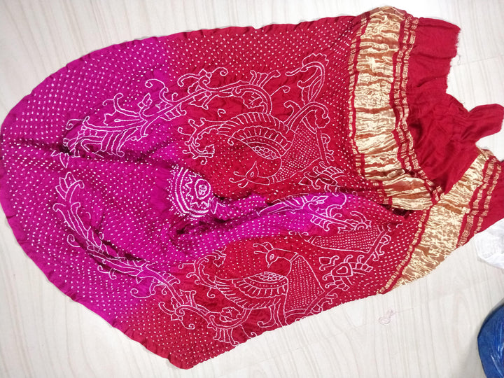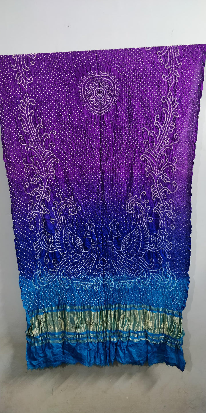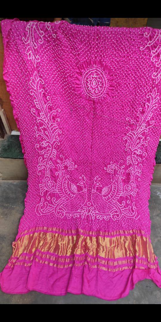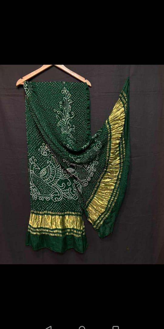 Step into timeless elegance with this royal Bandhani dupatta crafted from luxurious pure Gajji silk. Featuring intricate rai bandhej in a stunning peacock pattern and enhanced with gotapatti handwork, this piece is a true blend of tradition and craftsmanship.