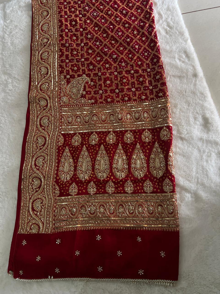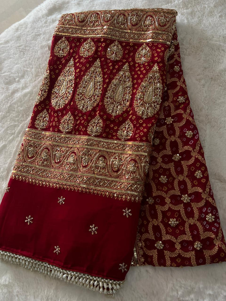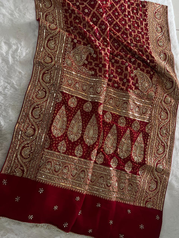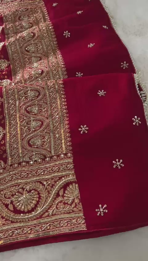 π« Shringar β Mehroon Shaadi Shagan Odhna π« In a regal deep mehroon, this traditional Pure Georgette Neemzari Dupatta is exquisitely hand-embellished with fine Zardozi, Marodi & Dabka handwork, making...