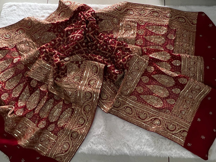 In a regal deep mehroon, this traditional Pure Georgette Neemzari Dupatta is exquisitely hand-embellished with fine Zardozi, Marodi & Dabka handwork, making it a perfect heirloom piece for weddings & grand festive occasions. πΉβ¨