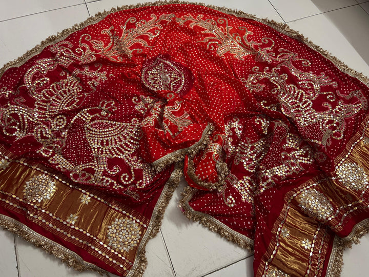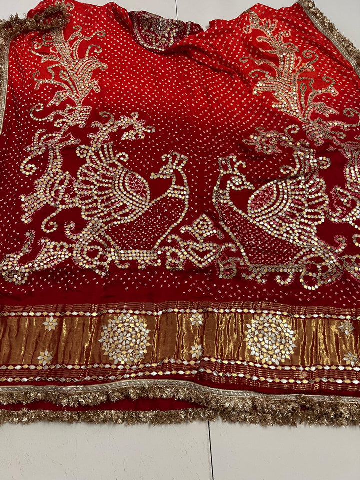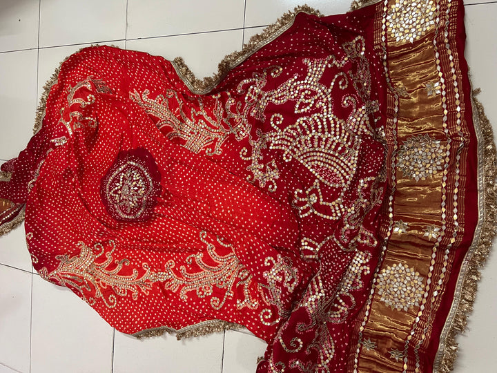 Elevate your traditional wardrobe with this exquisite Red Orange Bandhani Peeliya Dupatta, crafted from luxurious pure gajji silk. The dupatta showcases a stunning fusion of vibrant bandhani patterns, meticulously created by hand, along with intricate gotapatti and zardozi handwork that add a regal touch. Perfect for Indian weddings, festivals, or any special occasion, this dupatta brings elegance and grace to any ensemble. Handcrafted with attention to detail, it's a timeless accessory that enhances your ethnic attire with unmatched beauty and craftsmanship.