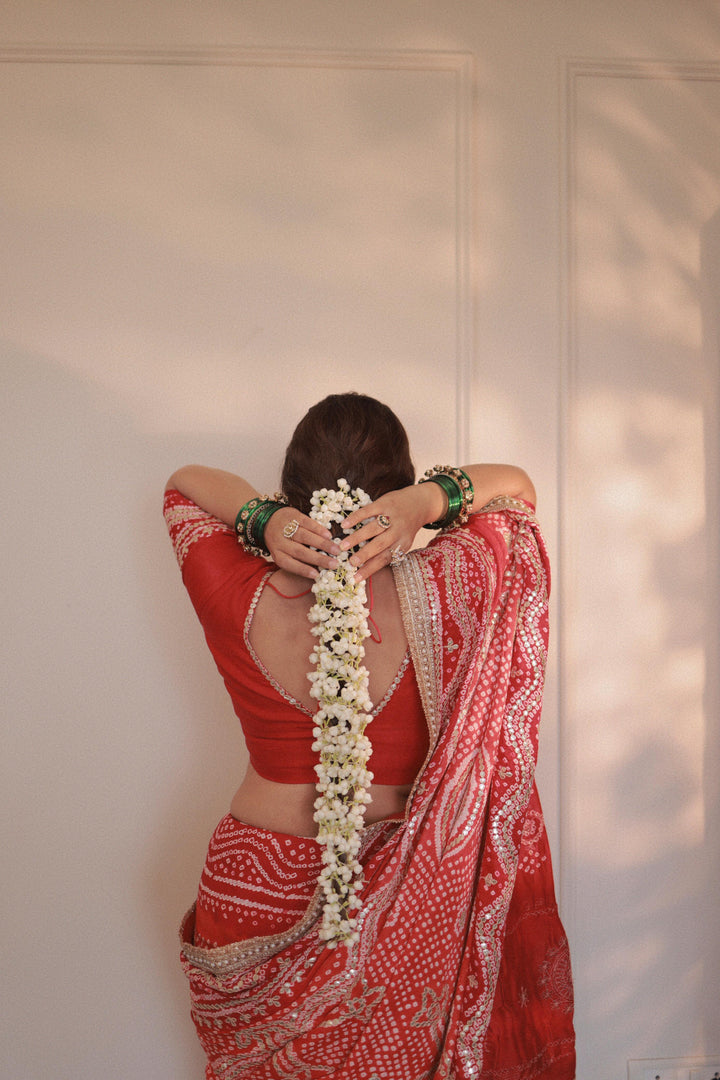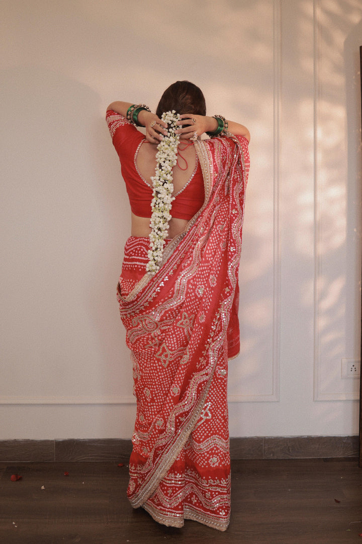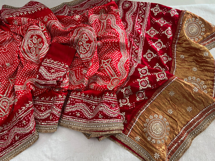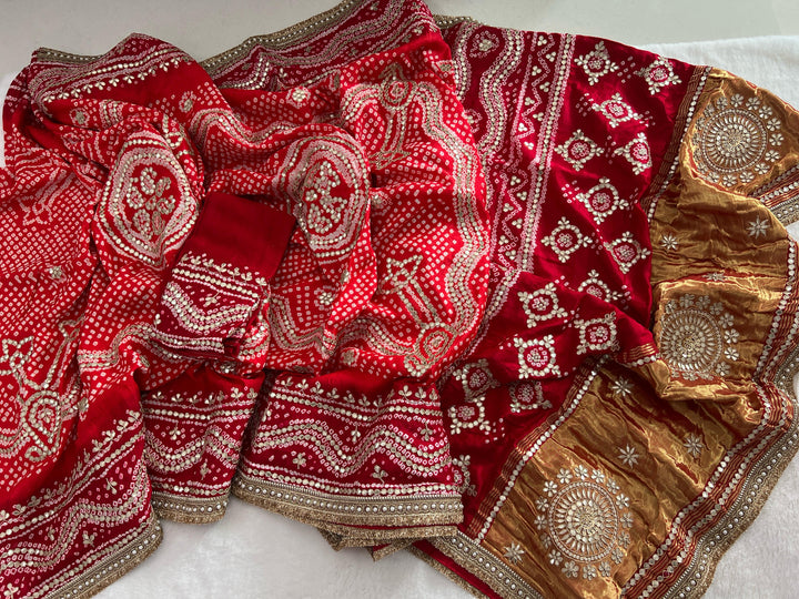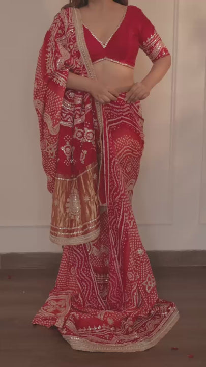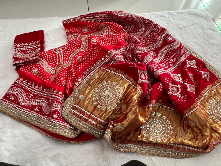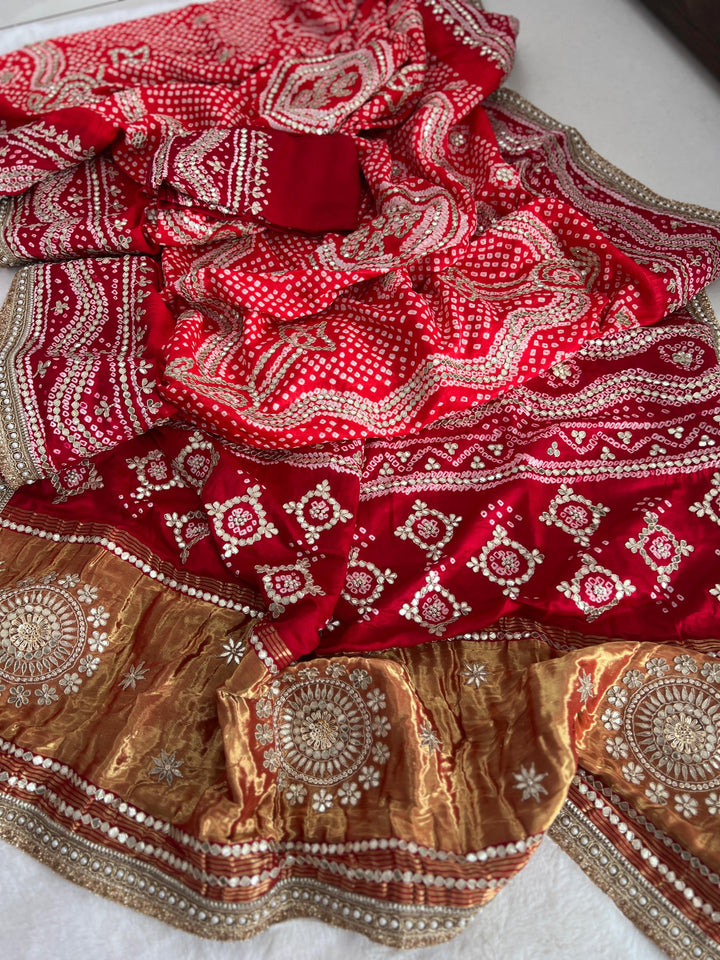 Step into timeless tradition with our Bandhani Peela Saree, handwoven in luxurious Pure Gajji Silk. This masterpiece features vibrant Rai Bandhej tie-dye in bold peela (yellow) and rani (magenta) hues, exuding grace and royalty. Intricately enhanced with Gotapatti, Zardozi, and Dori mix handwork, the saree celebrates heritage with every thread. The coordinated handworked blouse completes the regal ensemble with finesse. ๐