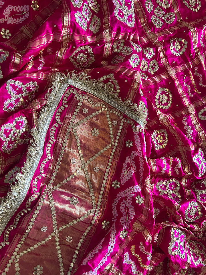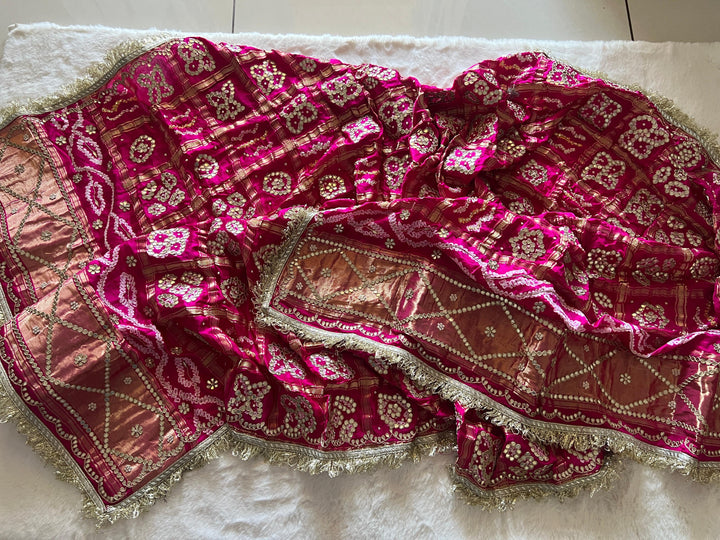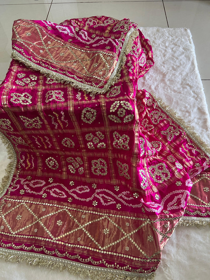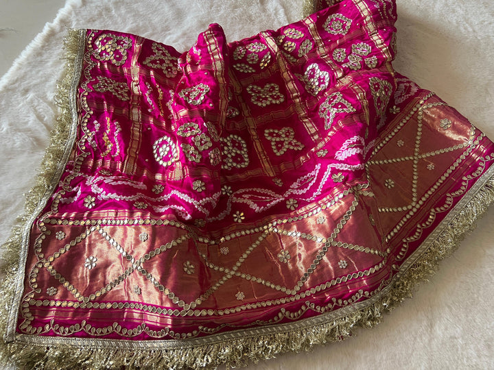 This royal bandhani dupatta is made from Pure Gajji Silk and features intricate handmade Rai Bandhej with beautiful Gotapatti handwork. Perfect for Indian weddings. Handcrafted with care, it is a must-have for any special occasion.