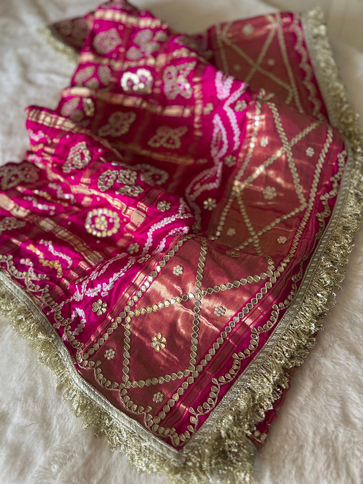 Beautiful Gharchola Rai Bandhani With Gotapatti, Zardozi Handwork in Pure Gajji Silk - Pink