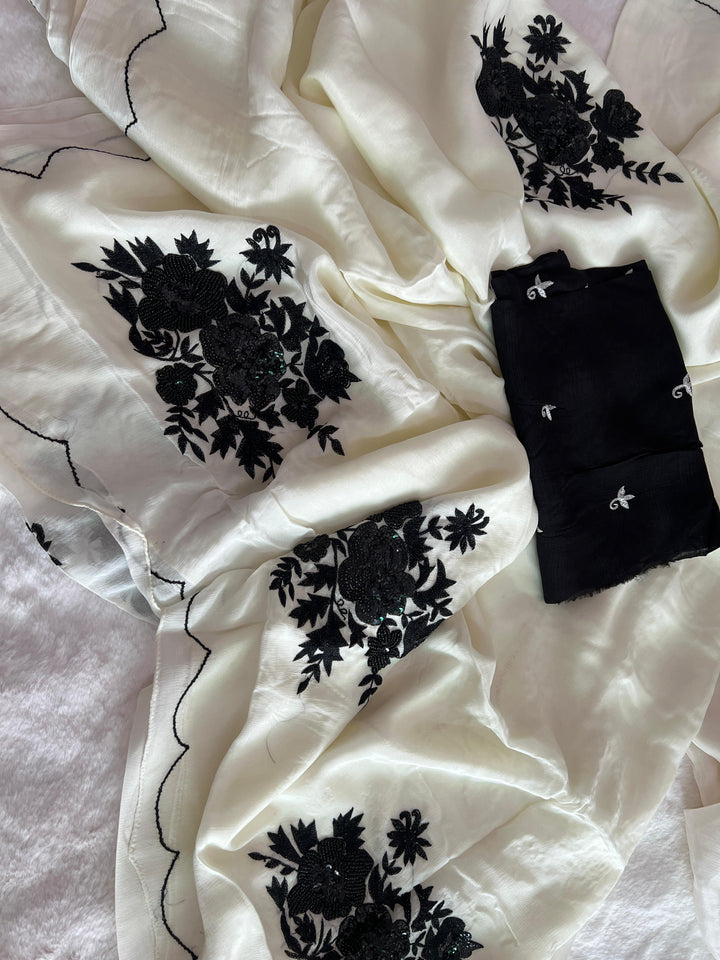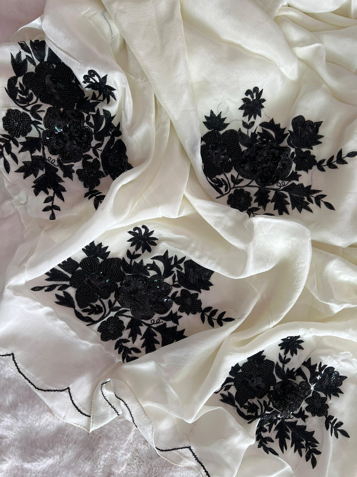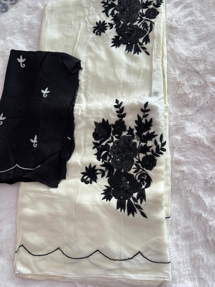 Beautiful Ivory-Coloured Chinnon Chiffon Saree - Black