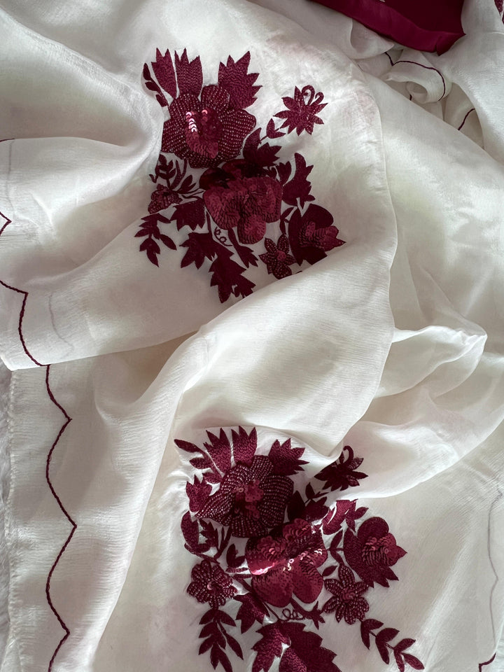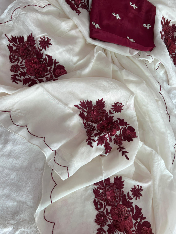 Fabric : Beautiful Ivory-Coloured Chinnon Chiffon Saree with Contrast Crepe Silk Blouse