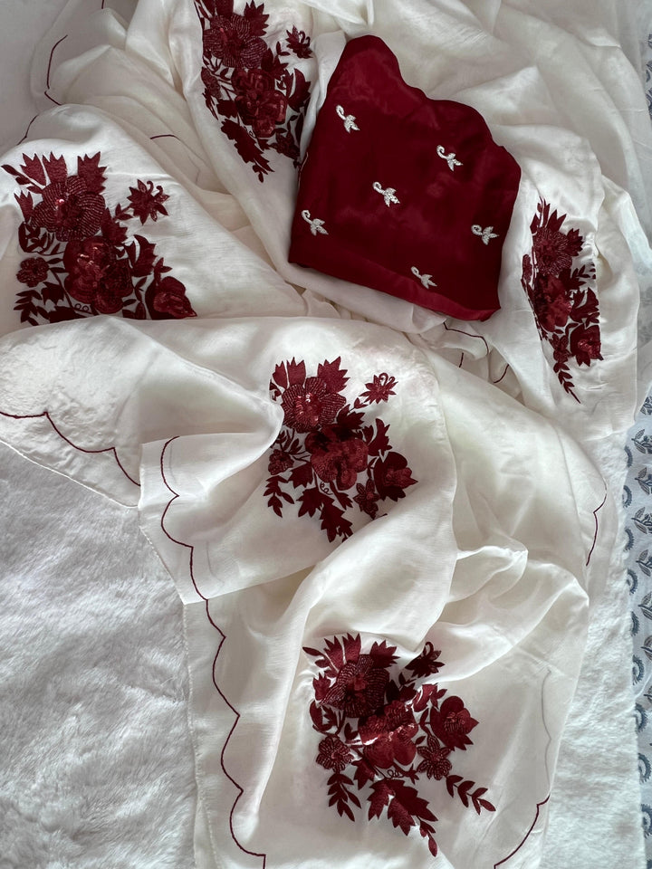 Beautiful Ivory-Coloured Chinnon Chiffon Saree - Red
