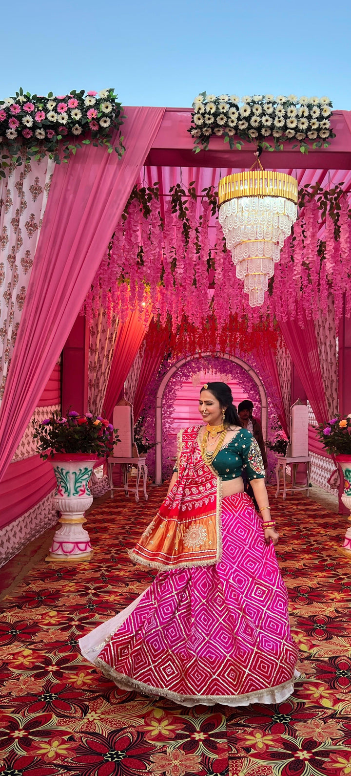 This exquisite bridal trousseau features a luxurious Pure Gajji Silk Red Rani Colored Gharchola Bandhej Saree, a perfect choice for your wedding celebrations. The saree is beautifully enhanced with intricate handwork, including Gotapatti, Zardozi, and Dori embroidery, adding a touch of regal charm. The Bandhej pattern offers a traditional yet vibrant appeal, making it a standout piece.
