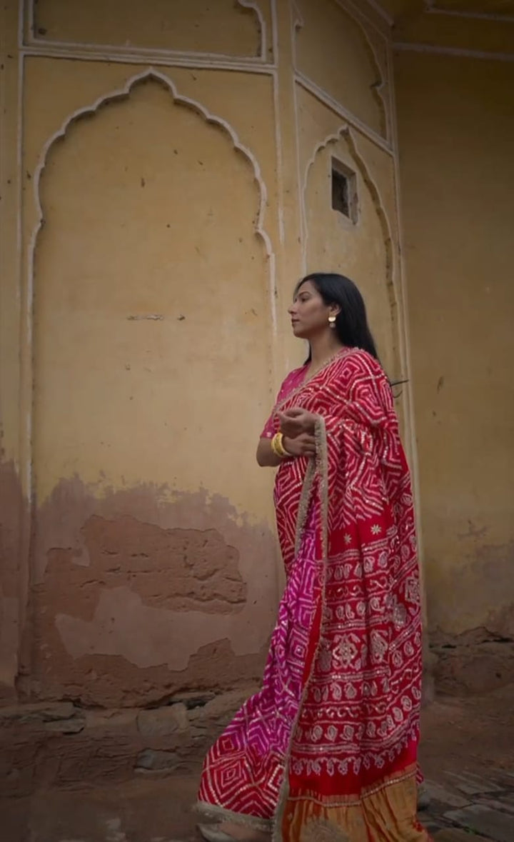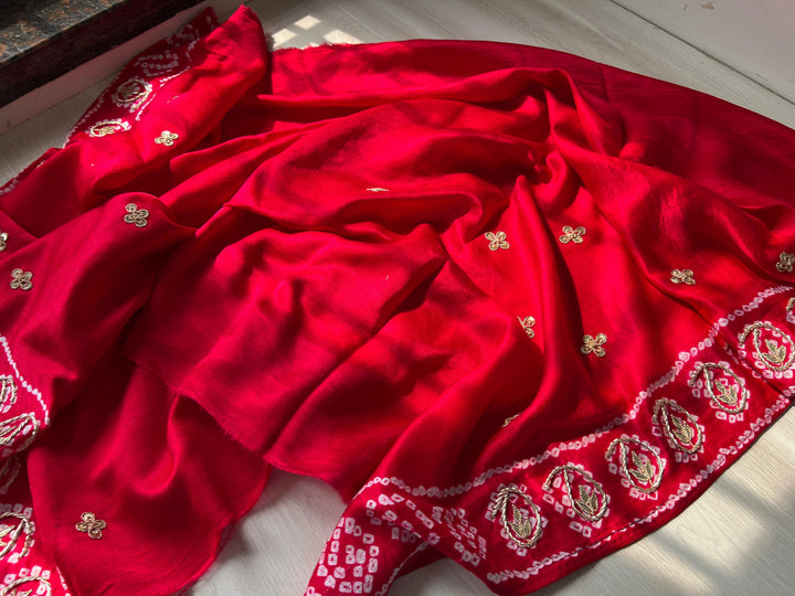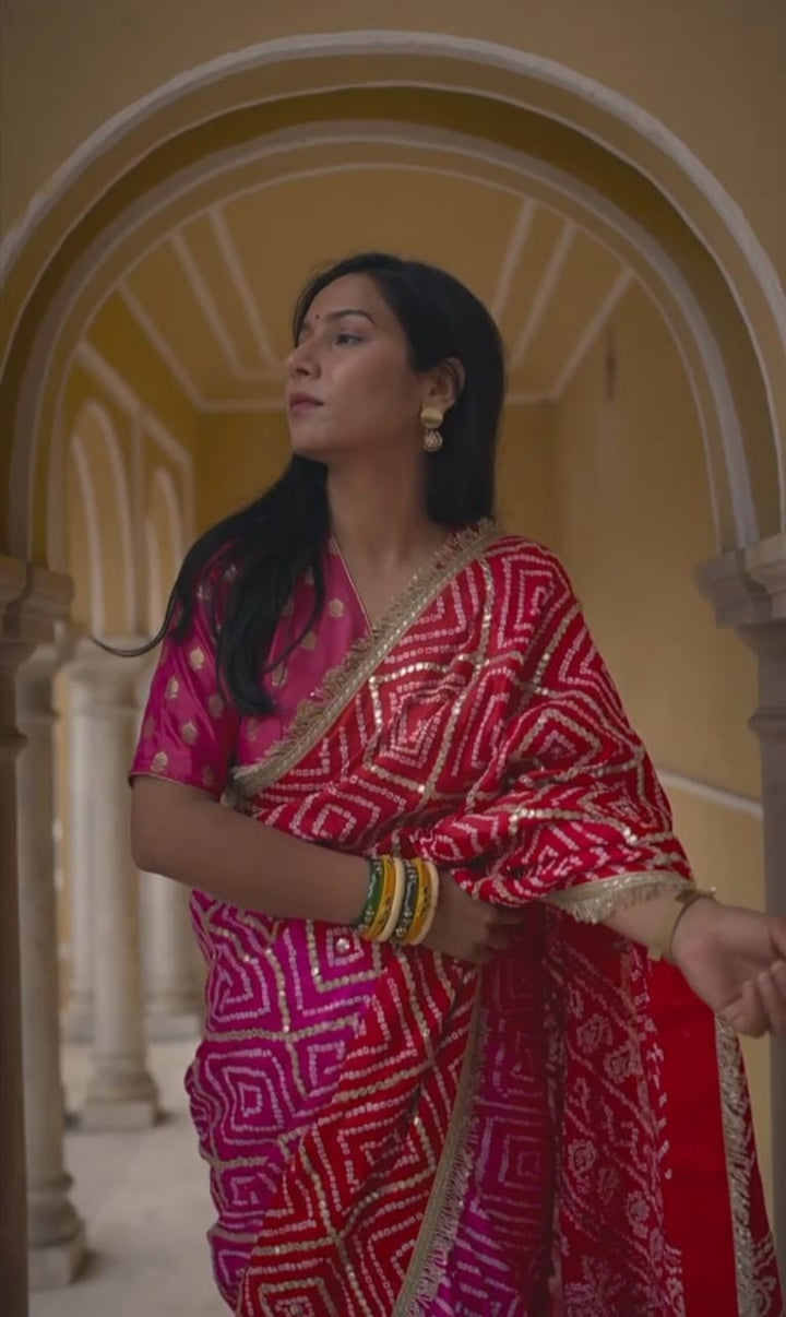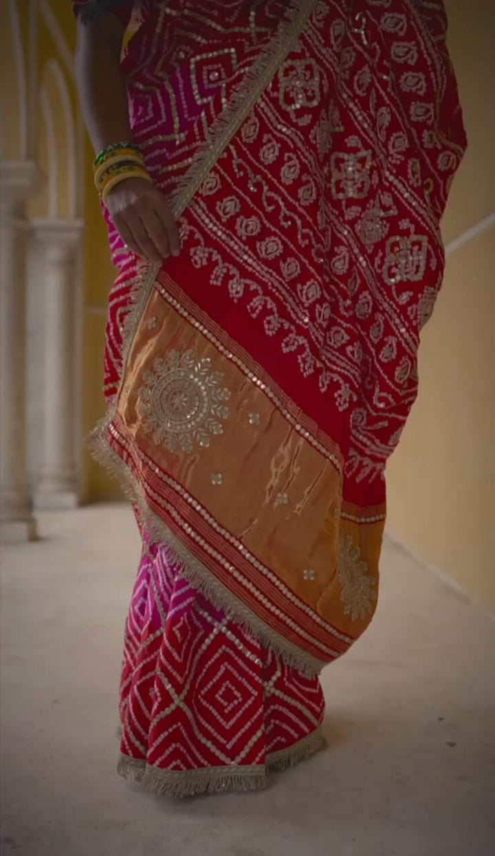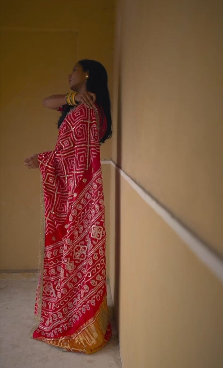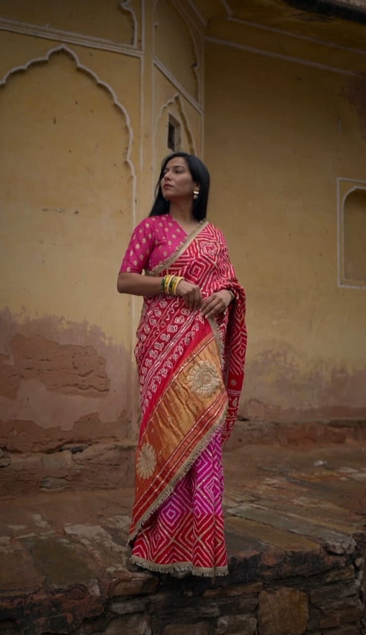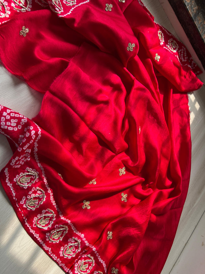 Fabric: Pure Gajji Silk Red Rani colored Gharchola Bandhej saree