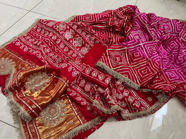 Item sold out currently. Pre-booking available up to 4-6 weeks in advance. This exquisite bridal trousseau features a luxurious Pure Gajji Silk Red Rani Colored Gharchola Bandhej Saree, a perfect choice...