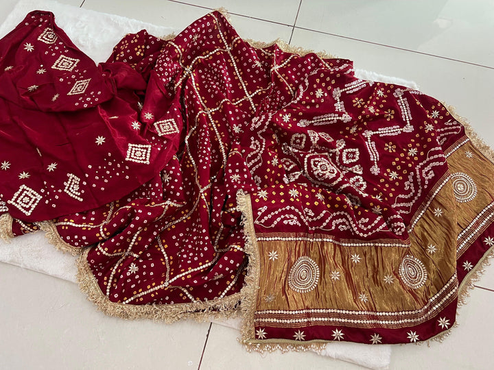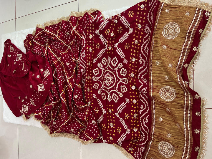 This Deep Mehroon Colored Pure Modal Silk Bandhej Saree is a stunning fusion of rich tradition and modern elegance. The saree features beautiful Bandhej patterns, with intricate Gotapatti and Zardozi handwork that adds a luxurious touch of embroidery to the fabric. The deep mehroon color exudes richness and sophistication, making it the perfect choice for weddings, celebrations, or festive occasions.