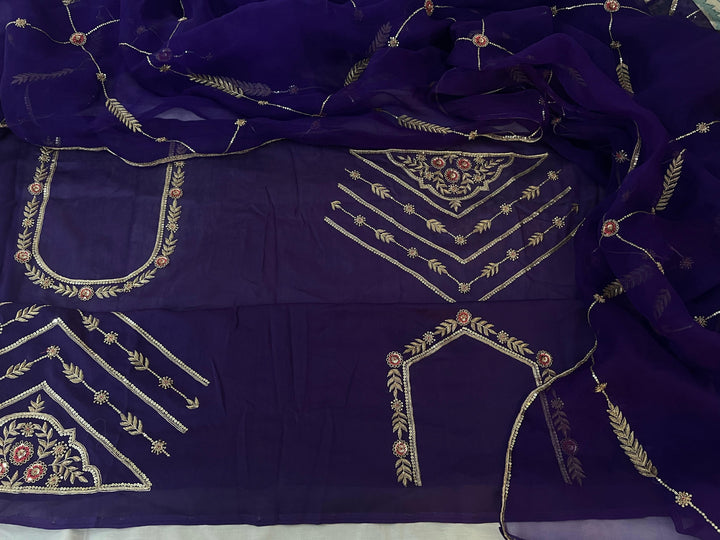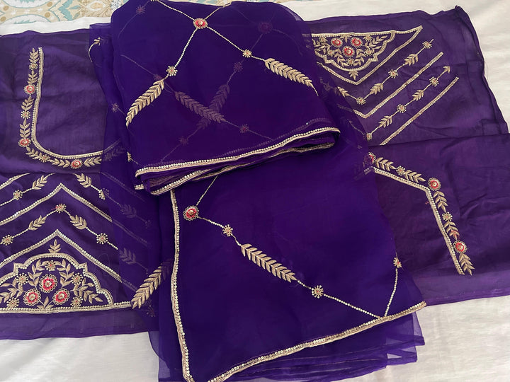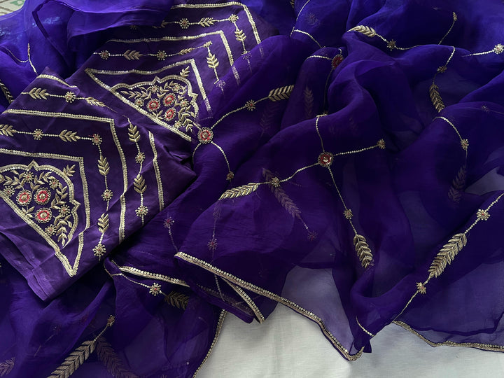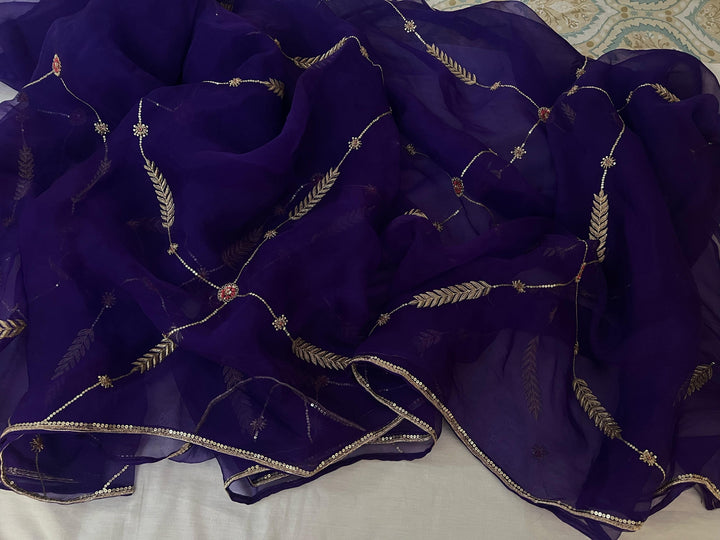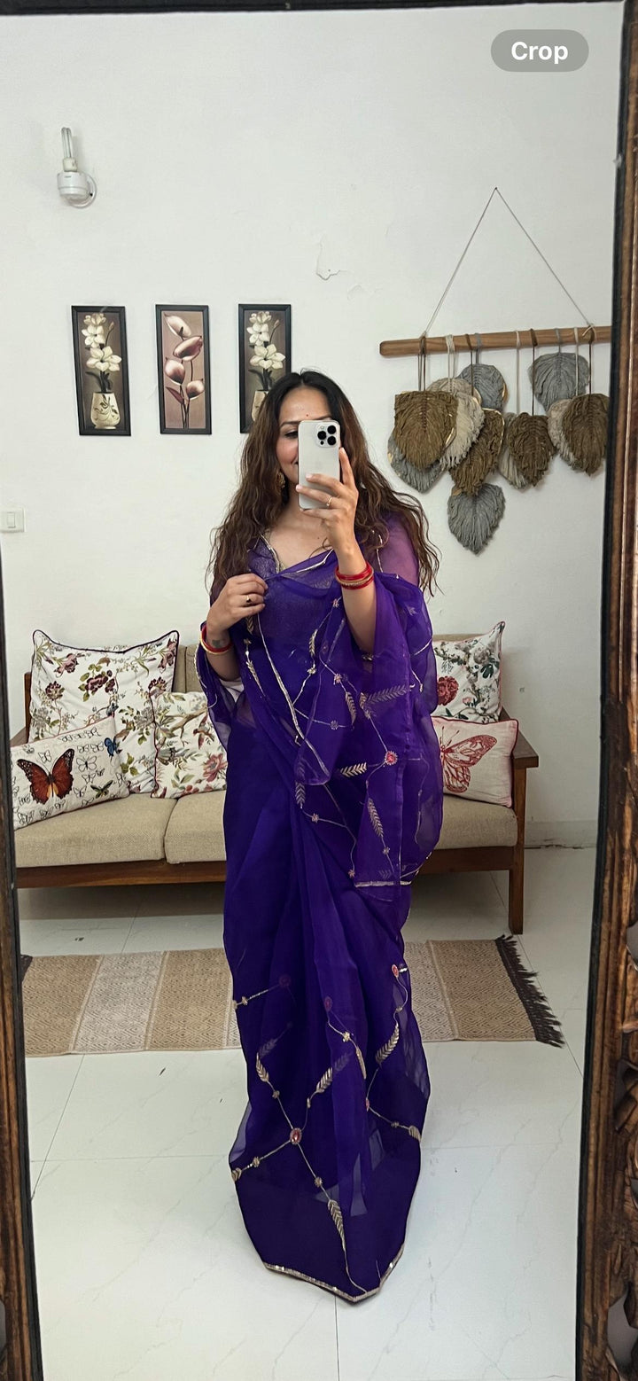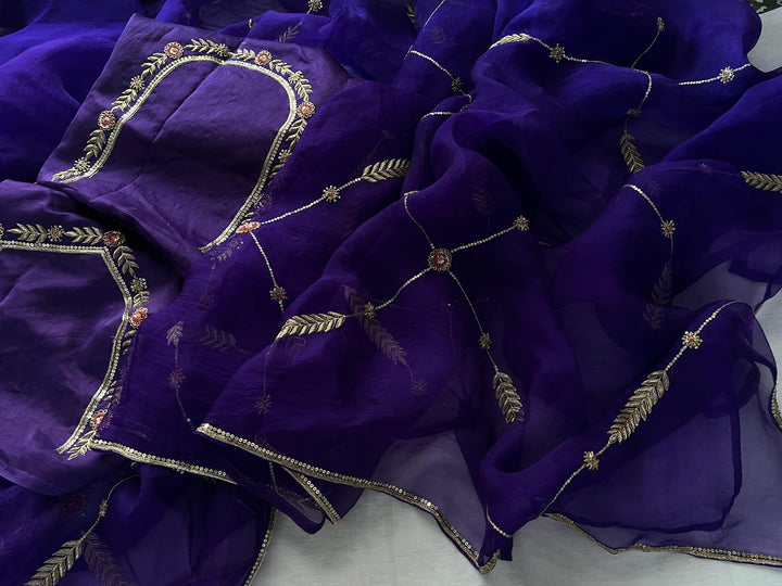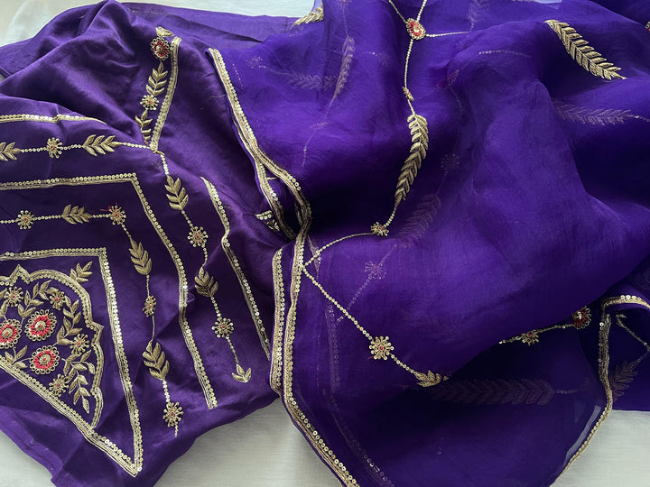 Indulge in the opulence of our Deep Purple Zardozi Jaal Saree, crafted from luxurious Pure Organza Silk for a truly regal look. This stunning saree is adorned with intricate Zardozi, Dabka, Resham, Sitara, and Dori handwork, creating a mesmerizing jaal pattern that flows across the fabric. The delicate yet captivating border enhances the overall elegance of the saree, making it perfect for weddings, festive occasions, and celebratory events.