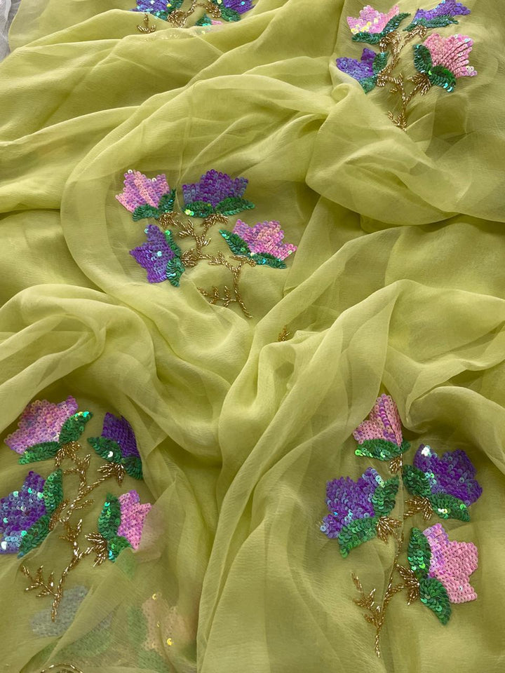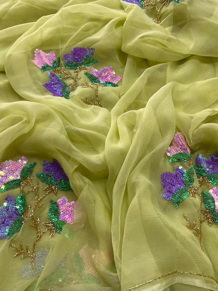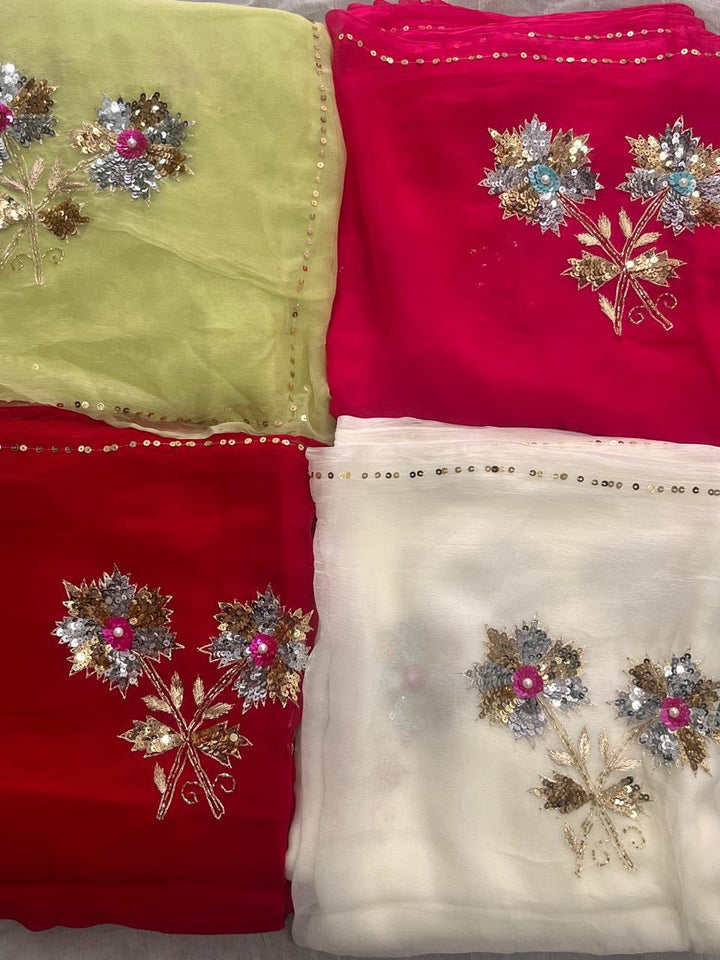 Step into a world of sophistication with the Diamond Chiffon Saree, a masterpiece that will make you the center of attention at any occasion. This elegant saree is beautifully enhanced with hand-embroidered multi-sequin floral motifs, artfully scattered all over the fabric, adding a touch of sparkle to its graceful flow. The saree features intricate embroidery on the palla and lower skirt, creating a striking visual appeal.