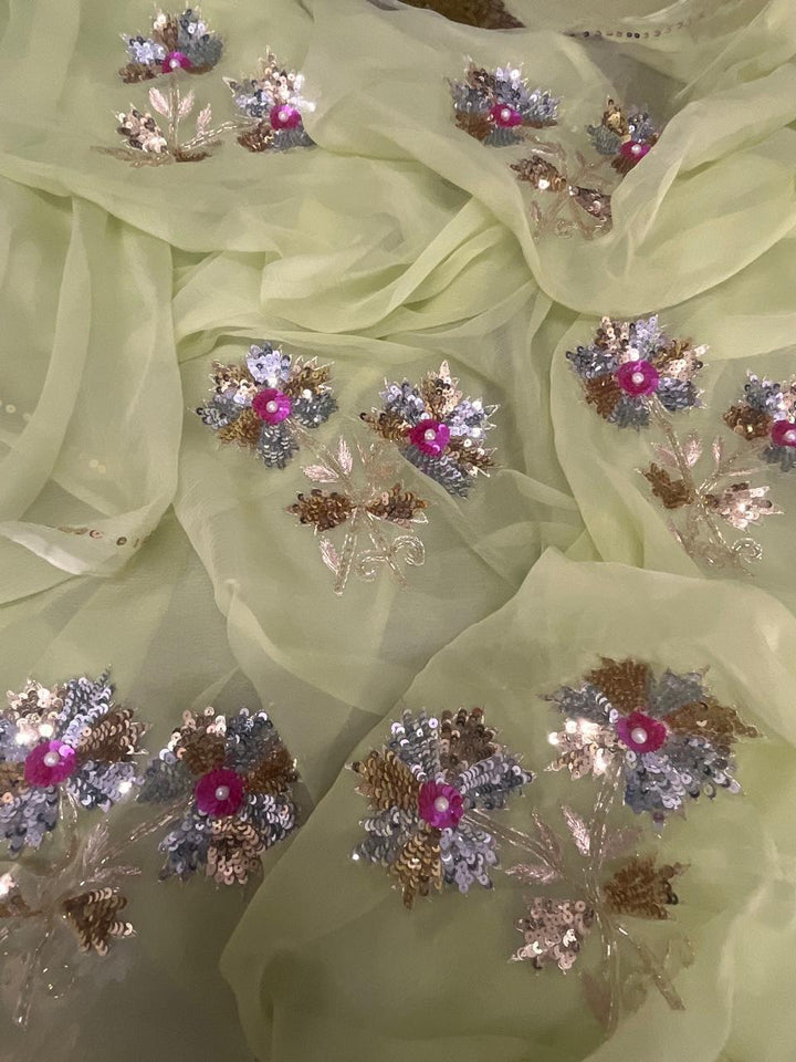 - Embroidery: Hand Embroidered Multi-Sequin Floral Motifs (Palla & Lower Skirt)