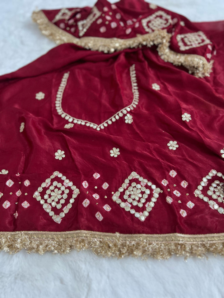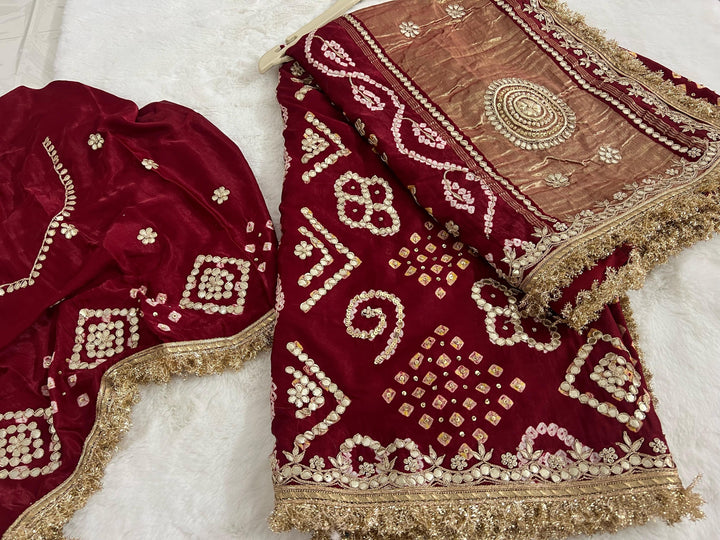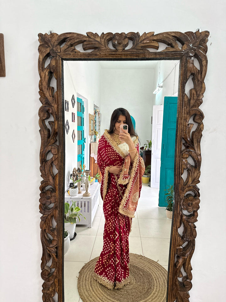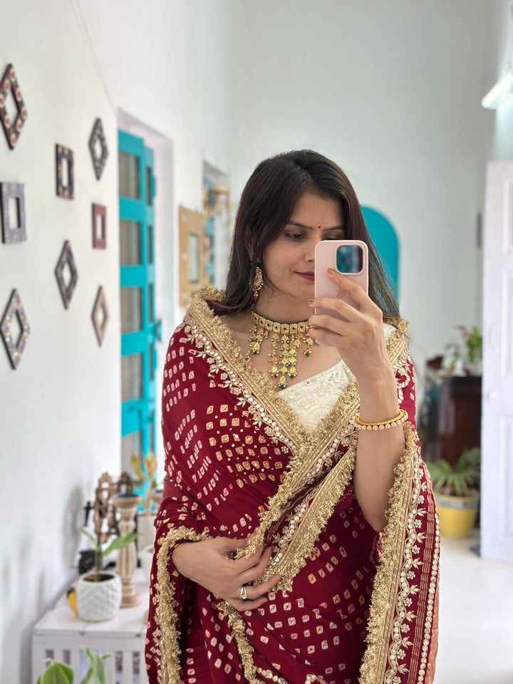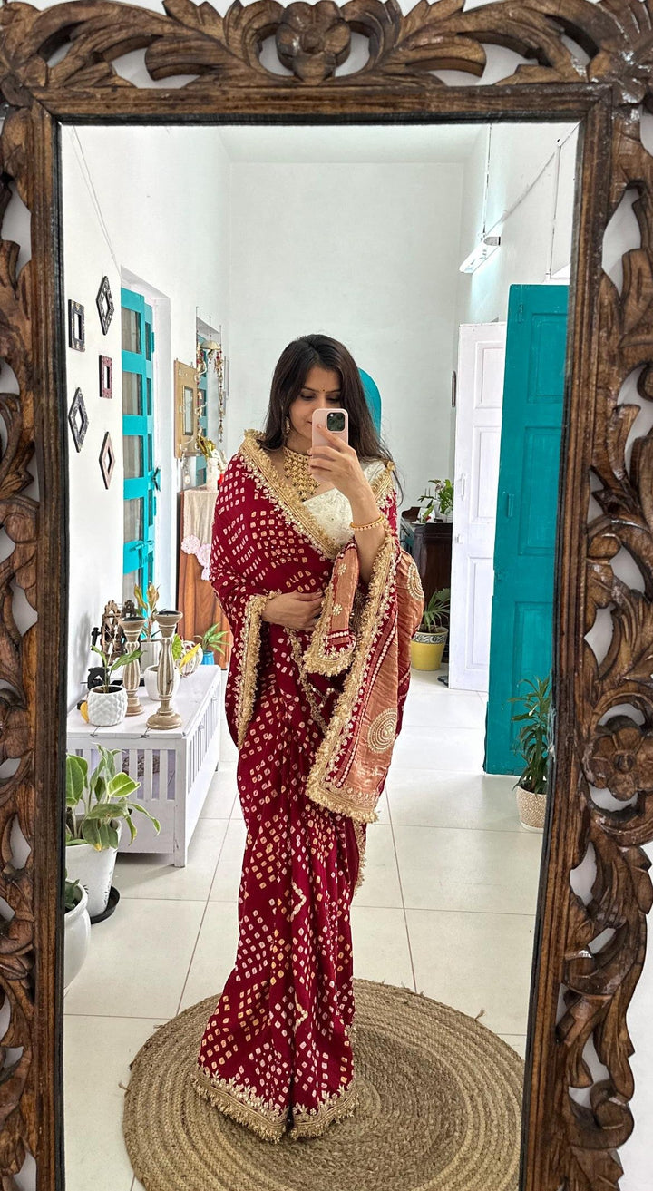 Product available upto 4-5 weeks in advance. Pre-Order Now! Exclusive Bandhani Saree Step into elegance with this Pure Modal Satin Handwoven Bandhej Mehroon Saree, featuring intricate Gotapatti, Zardozi, and Dori...