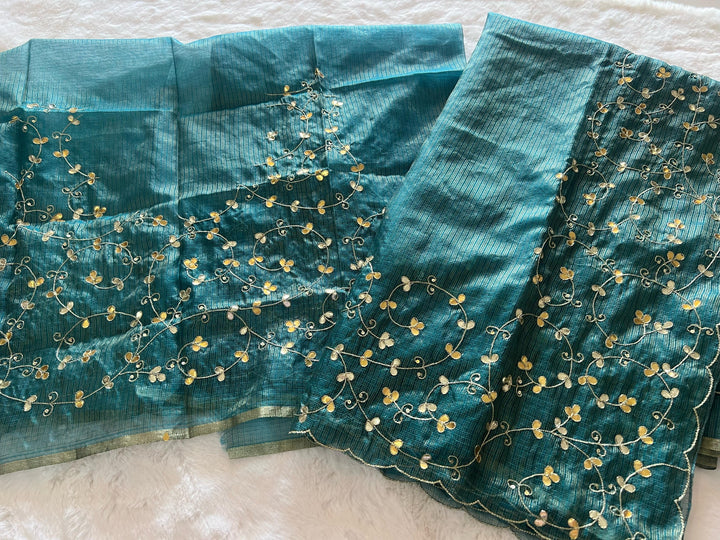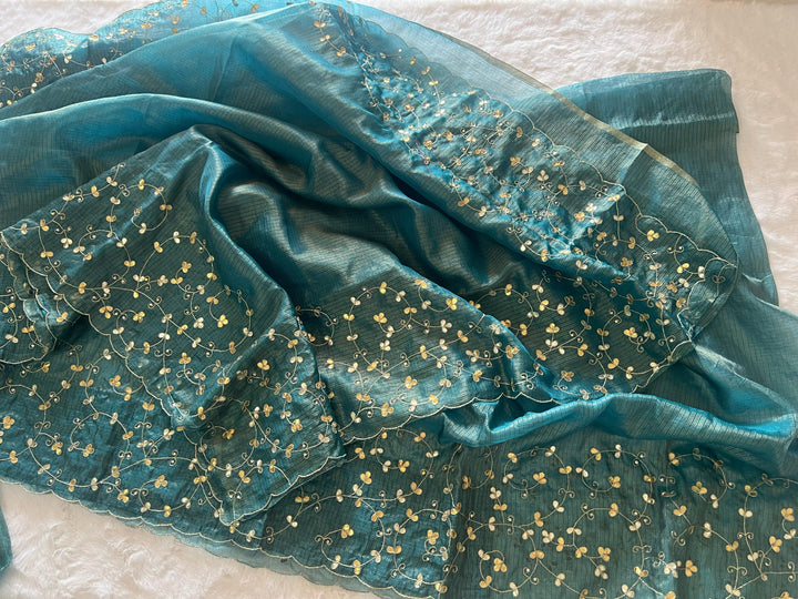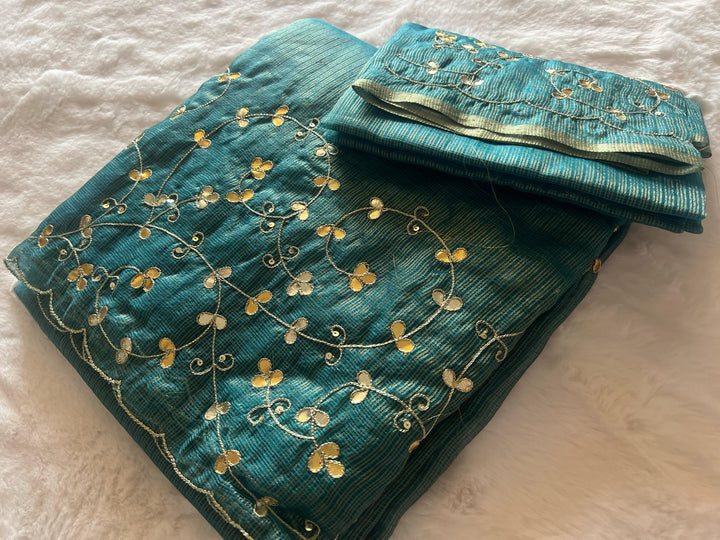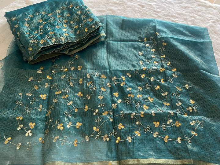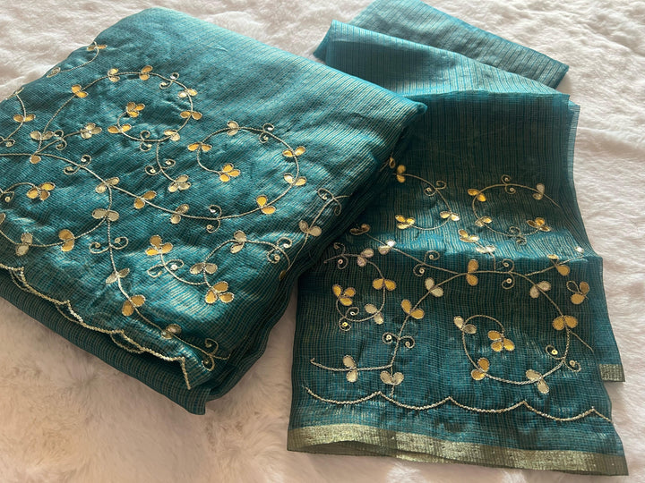 This Pure Kota Silk Tissue Saree is a timeless masterpiece, designed to exude grace and sophistication. The delicate fabric of Kota silk gives the saree a soft, lightweight feel, while the shimmering tissue finish adds an elegant touch. The saree is intricately adorned with beautiful Gotapatti Jaal handwork, creating a stunning pattern that enhances its traditional charm. The work is meticulously crafted, showcasing fine artistry that reflects heritage and luxury. Paired with a running blouse, this saree offers versatility and the option to customize your perfect look. Ideal for festive occasions, this saree is sure to make a lasting impression with its graceful appeal and intricate detailing.